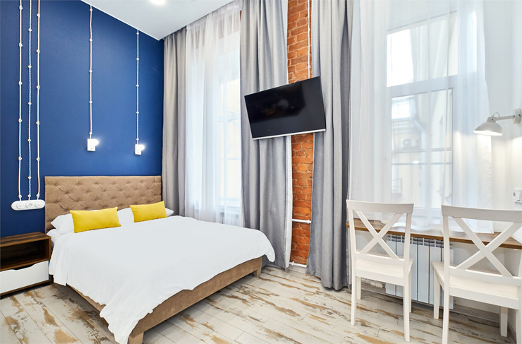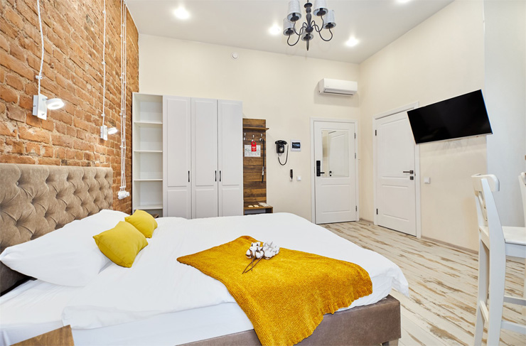 В номере: вешалка, зеркало, кровать двуспальная, прикроватные тумбочки, стол, стулья, шкаф, кондиционер, микроволновая печь, мини-холодильник, набор посуды, плита электрическая, сейф, телевизор, телефон, электрочайник