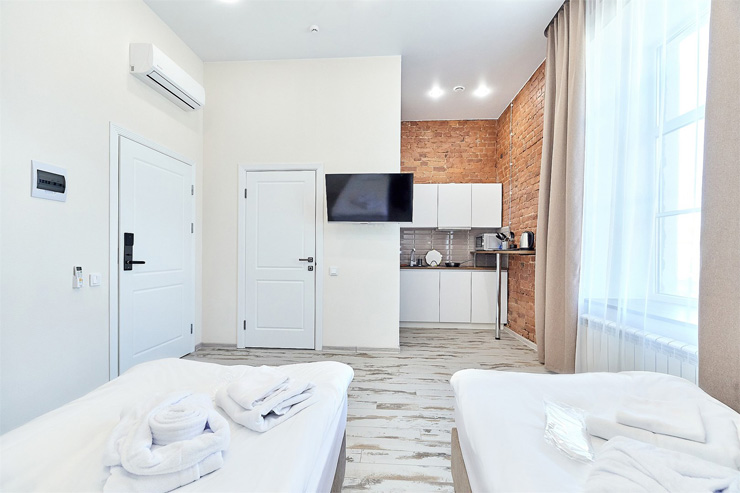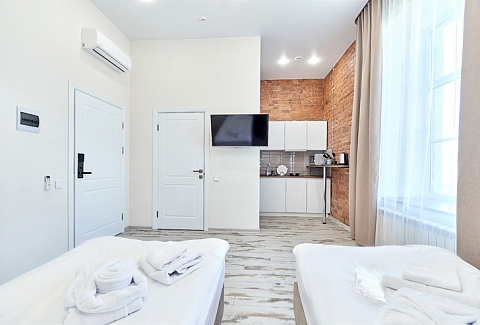 В номере: вешалка, зеркало, кровати односпальные, прикроватные тумбочки, стол, стулья, шкаф, кондиционер, микроволновая печь, мини-холодильник, набор посуды, плита электрическая, посудомоечная машина, сейф, стиральная машина, телевизор, телефон, электрочайник