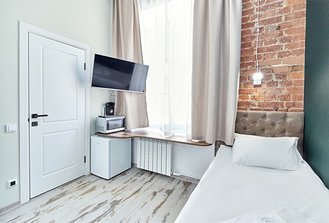 В номере: вешалка, зеркало, кровать односпальная, стол, кондиционер, микроволновая печь, мини-холодильник, сейф, телевизор, телефон, чайная станция, чайный набор посуды