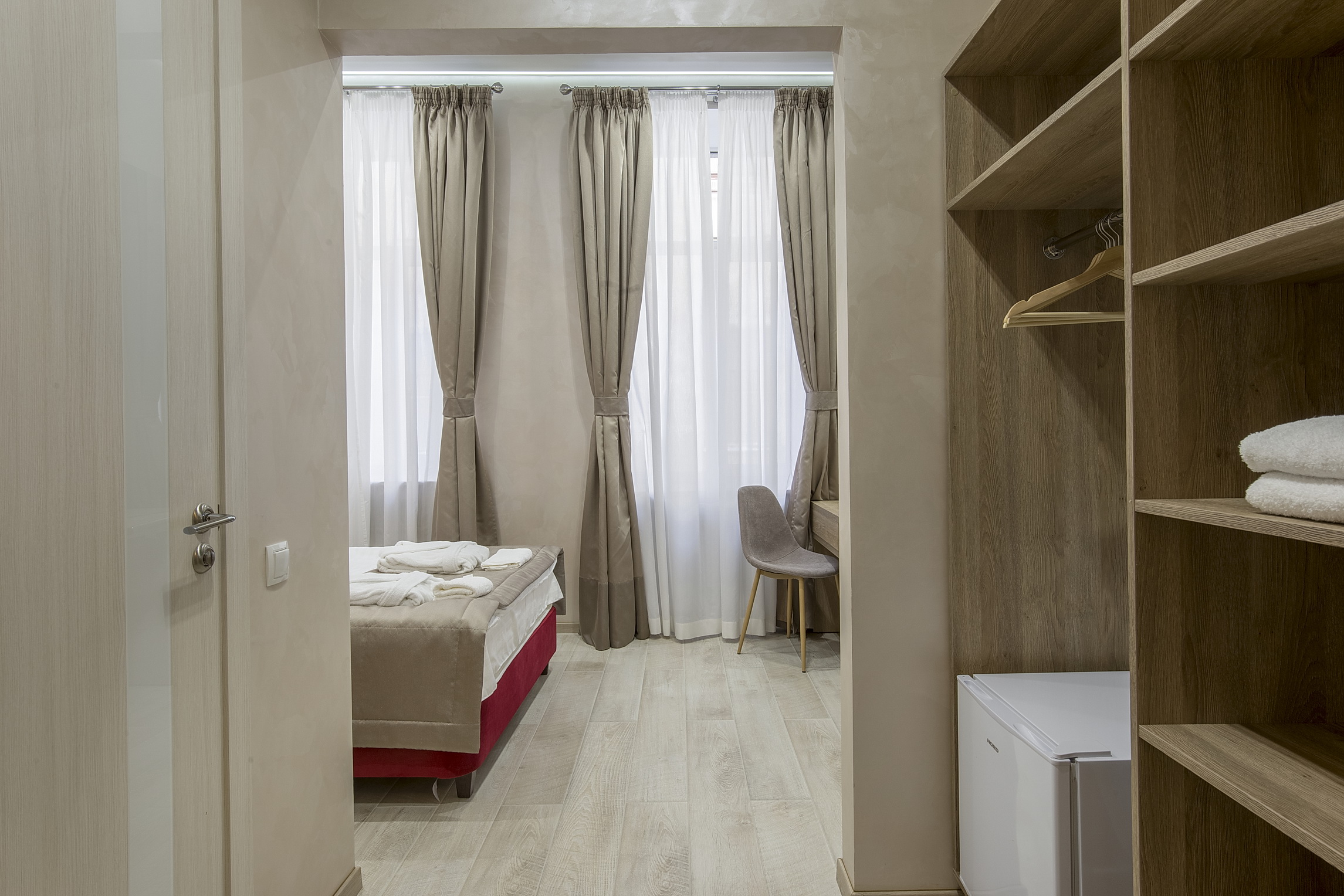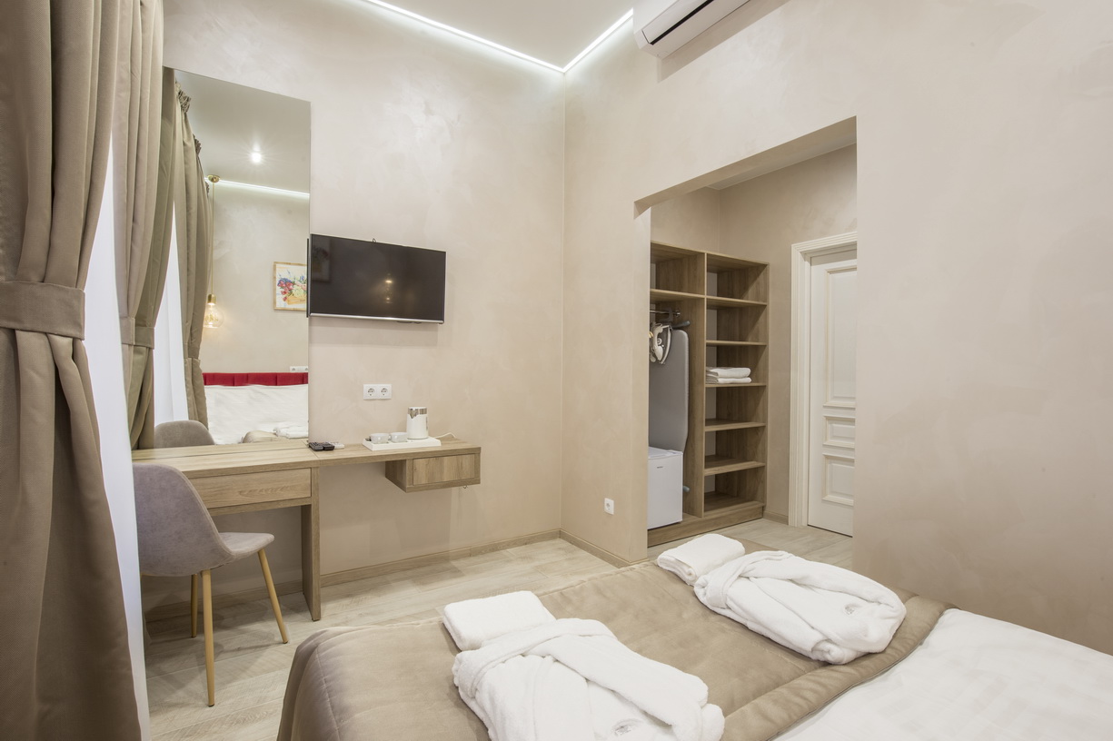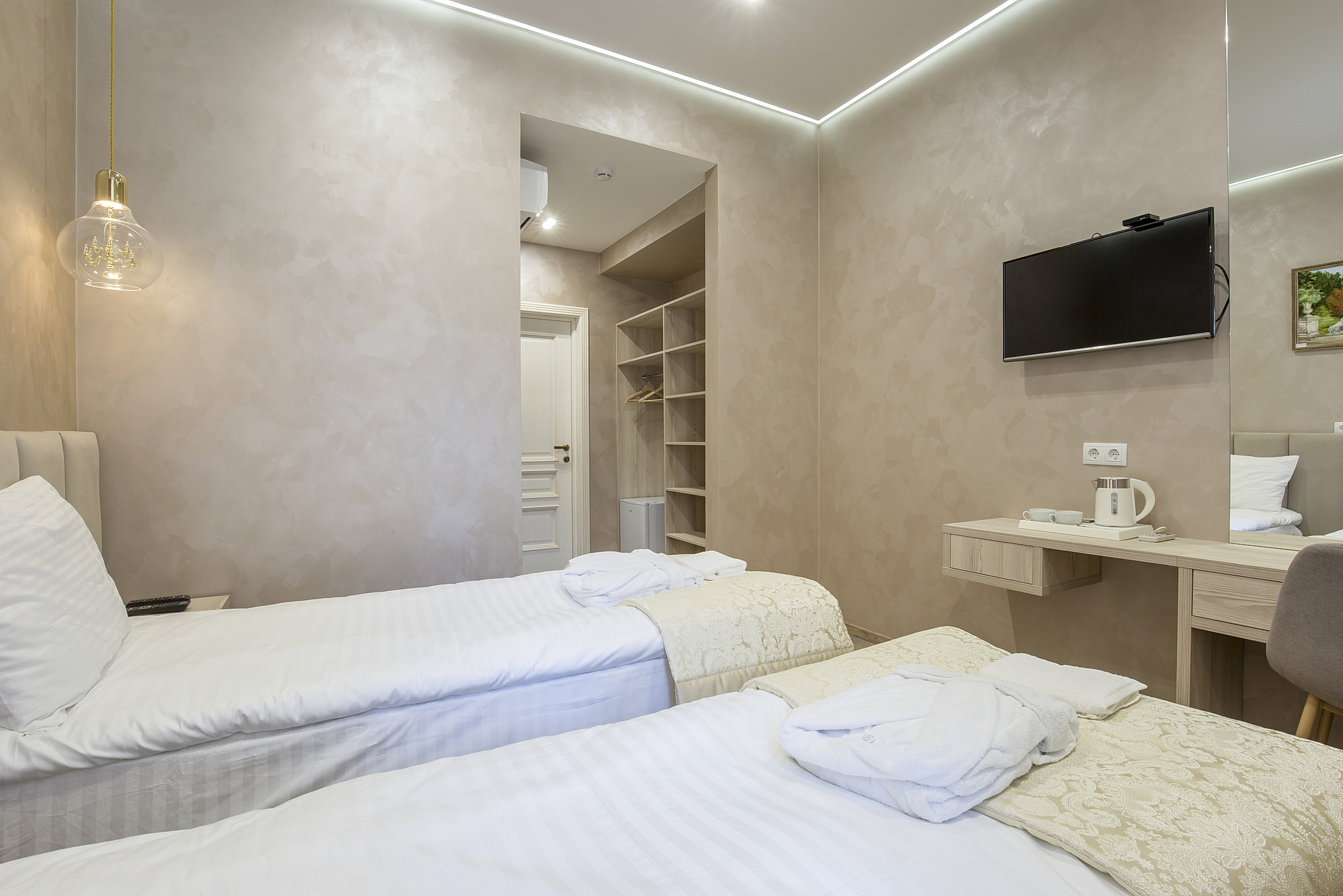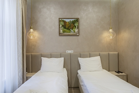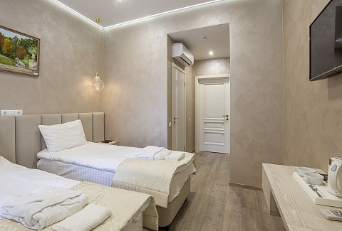 В номере: кровати односпальные, прикроватные тумбочки, стол, стулья, шкаф, кондиционер, сейф, телевизор ЖК, чайная станция