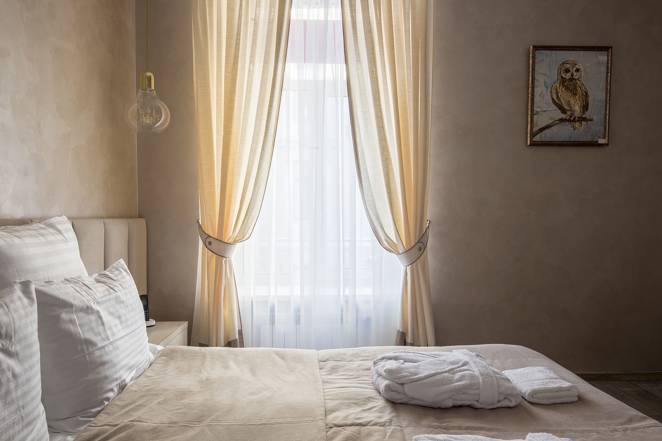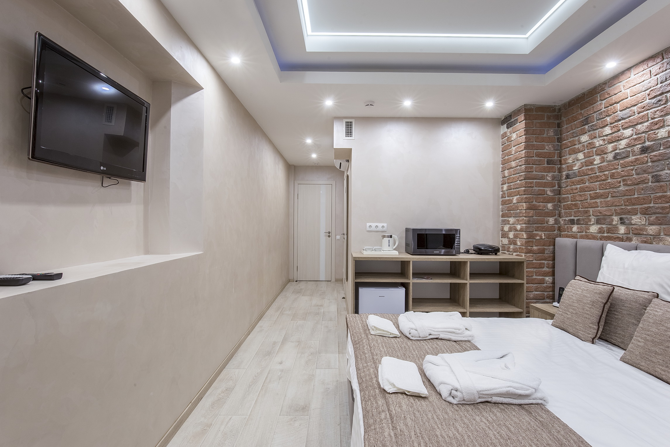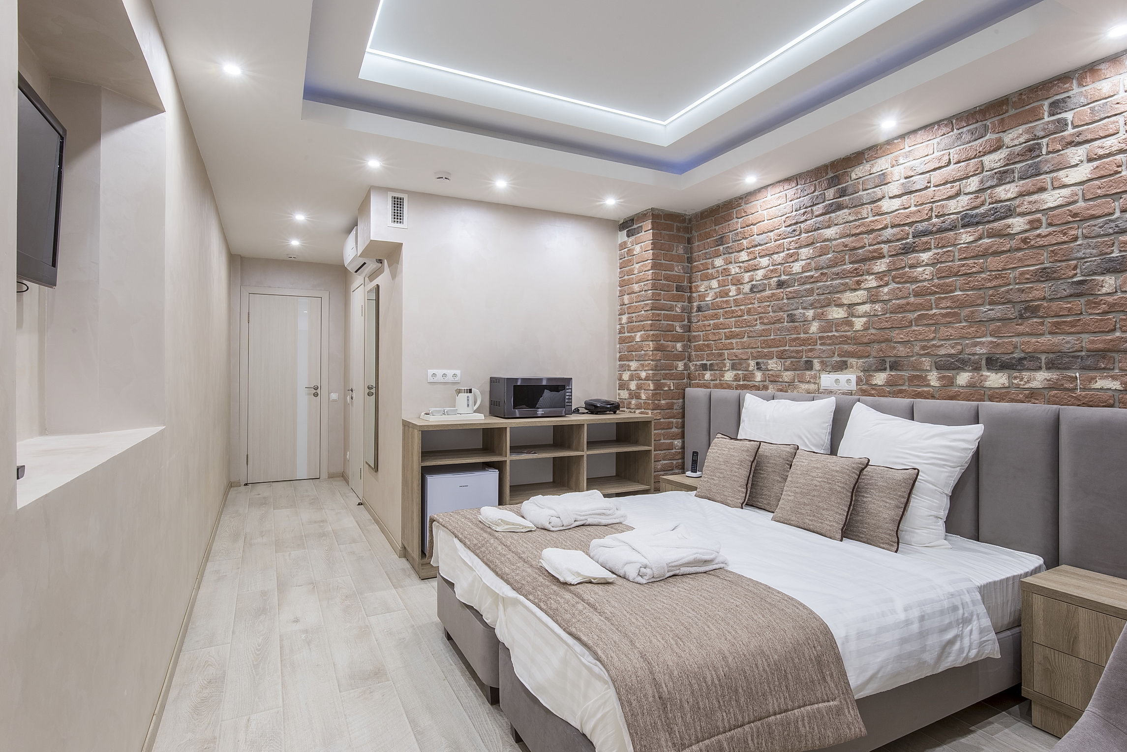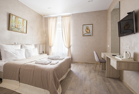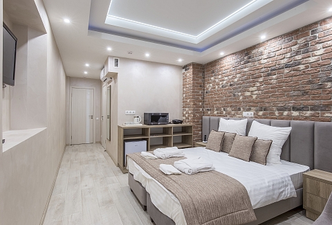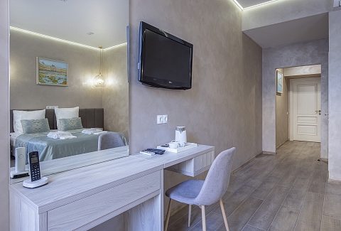 В номере: кровать двуспальная, прикроватные тумбочки, стол, стулья, шкаф, кондиционер, сейф, телевизор ЖК, телефон, чайная станция