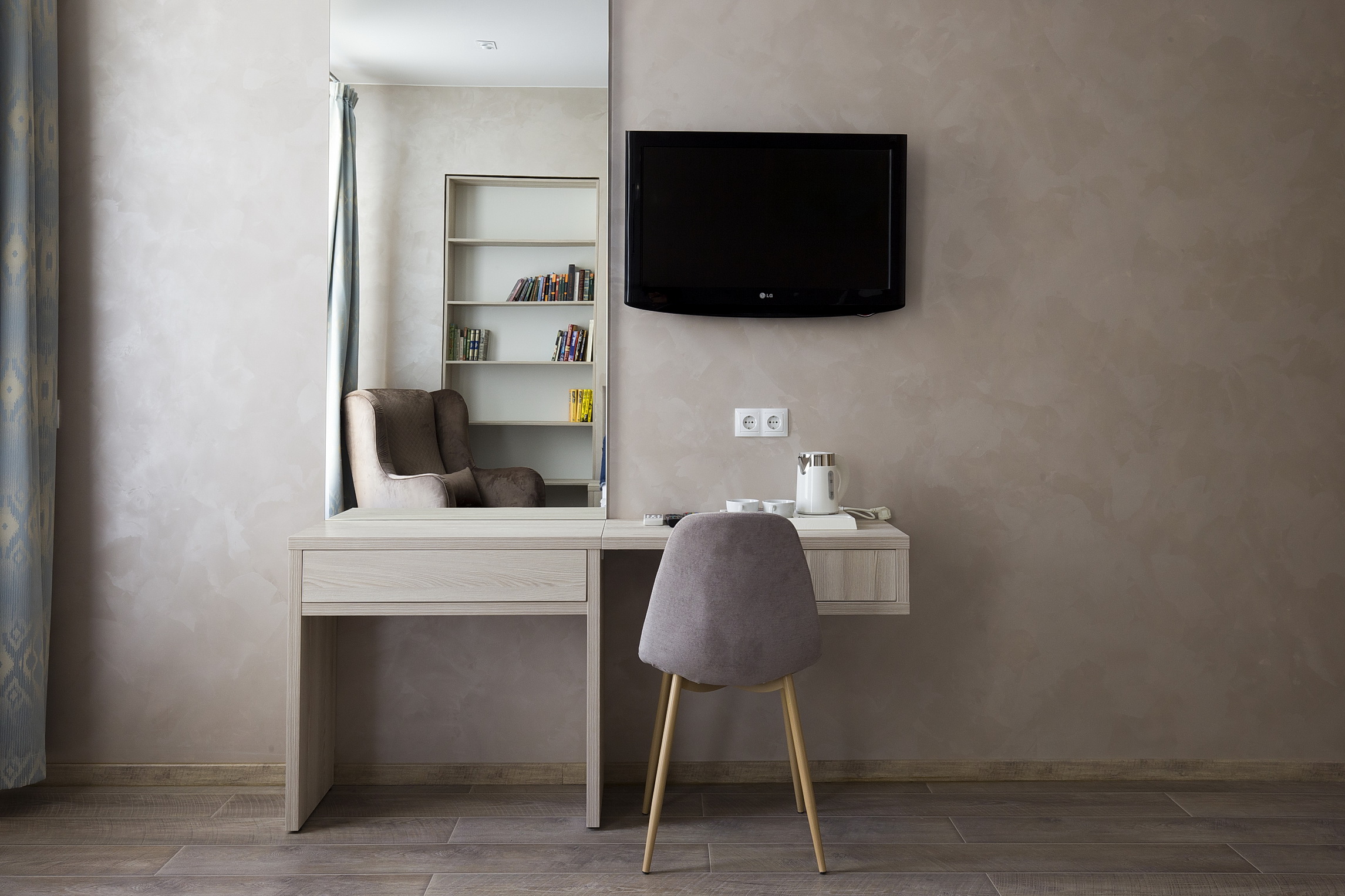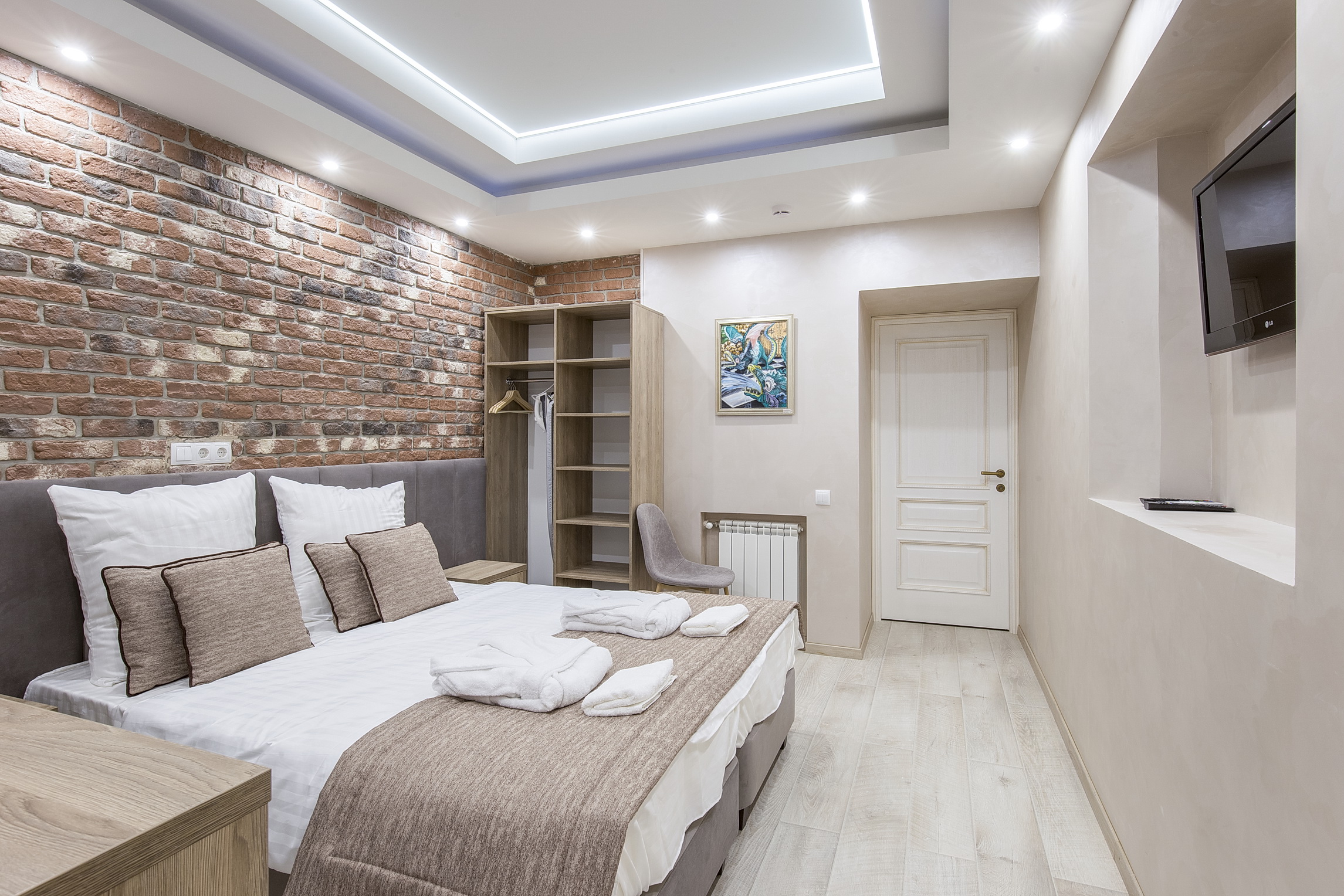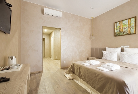 В номере: кровать двуспальная, прикроватные тумбочки, стол, стулья, шкаф, кондиционер, сейф, телевизор ЖК, чайная станция