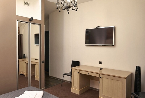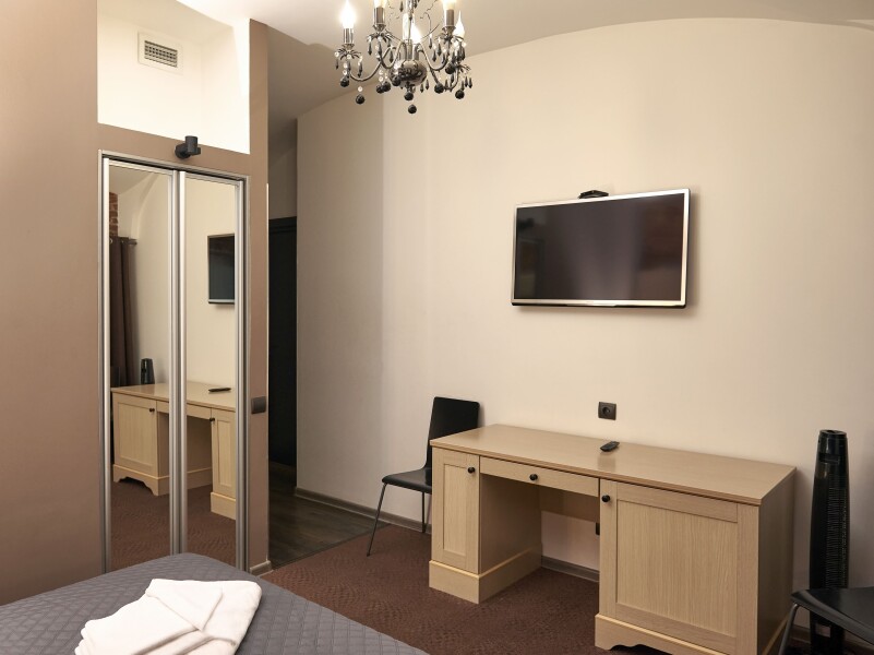 В номере: вешалка, зеркало, кровать двуспальная, прикроватные тумбочки, стол, стулья, шкаф, телевизор