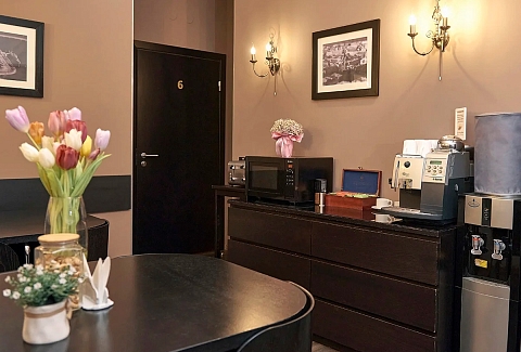 - общая кухня микроволновка, холодильник, столовые приборы, кофе/чай, чайник