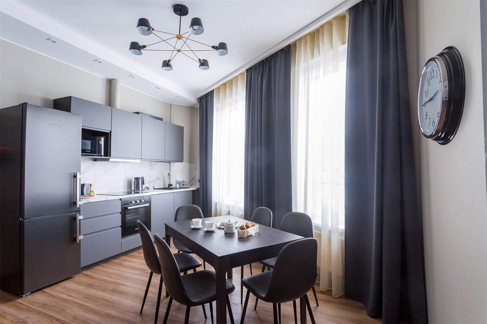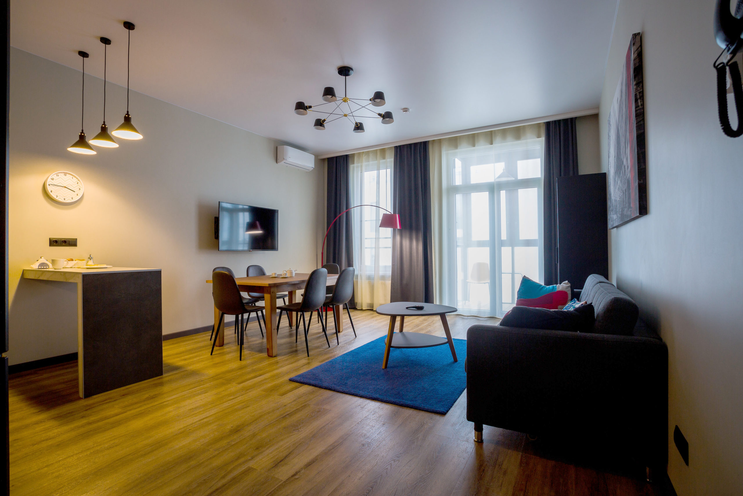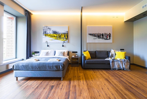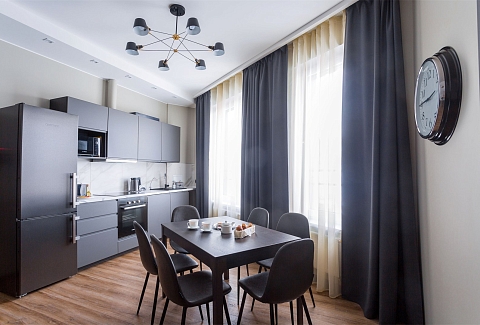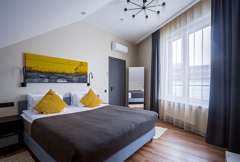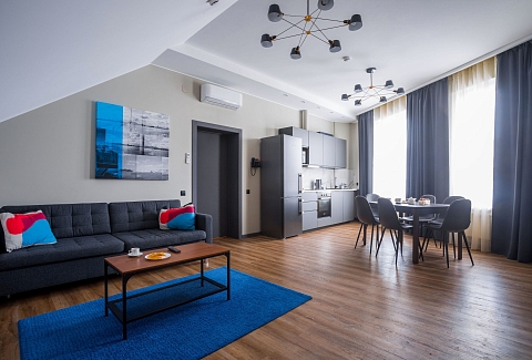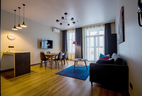 В номере: вешалка, диван, зеркало, кровать двуспальная, прикроватные тумбочки, стол, стулья, шкаф, кондиционер, микроволновая печь, набор посуды, плита электрическая, посудомоечная машина, сейф, стиральная машина, телевизор, холодильник, электрочайник