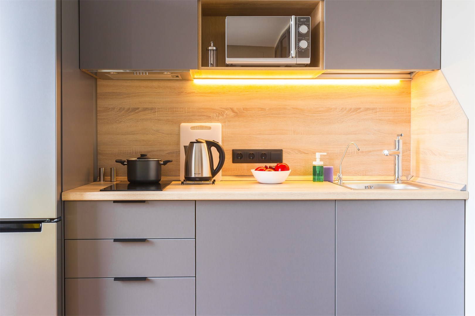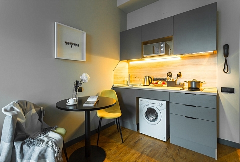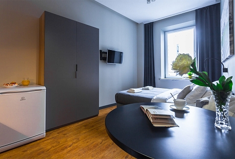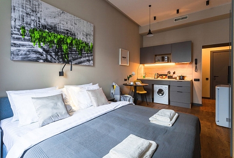 В номере: вешалка, диван, зеркало, кровать двуспальная, прикроватные тумбочки, стол, стулья, шкаф, микроволновая печь, набор посуды, плита электрическая, сейф, стиральная машина, телевизор, холодильник, электрочайник