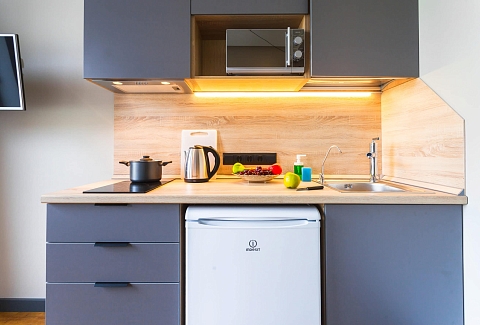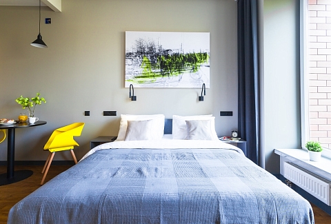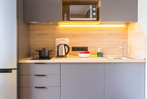 В номере: вешалка, зеркало, кровать двуспальная, прикроватные тумбочки, стол, стулья, шкаф, микроволновая печь, мини-холодильник, набор посуды, плита электрическая, сейф, стиральная машина, телевизор, электрочайник