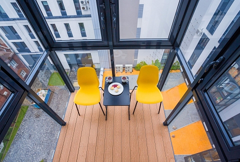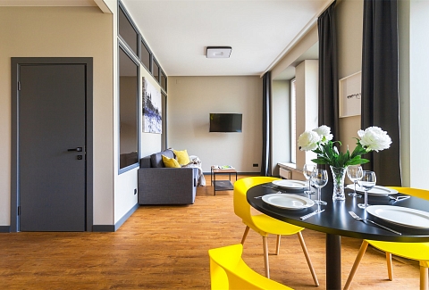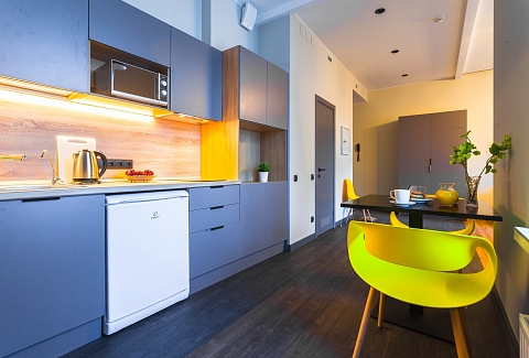 Отель разместился в шестиэтажном здании, возвышающемся на Большой Зелениной улице. В распоряжении гостей 39 номеров разных категорий комфорта. В каждом номере имеется собственная ванная комната и мини-кухня с электроплитой и стиральной машиной, подключен беспроводной интернет. В номерах улучшенной категории предусмотрена гостиная зона и балкон. В отеле работает кафе, также в распоряжении гостей тренажерный зал, крытая охраняемая парковка, а для детей организована игровая комната.
