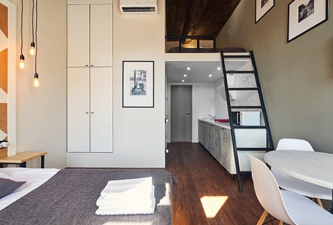 В номере: вешалка, зеркало, кресло-кровать, кровать двуспальная, прикроватные тумбочки, стол, стулья, шкаф, кондиционер, микроволновая печь, мини-холодильник, набор посуды, плита электрическая, сейф, телевизор, электрочайник