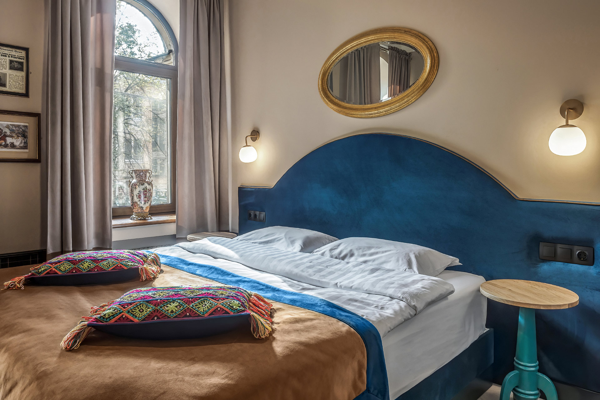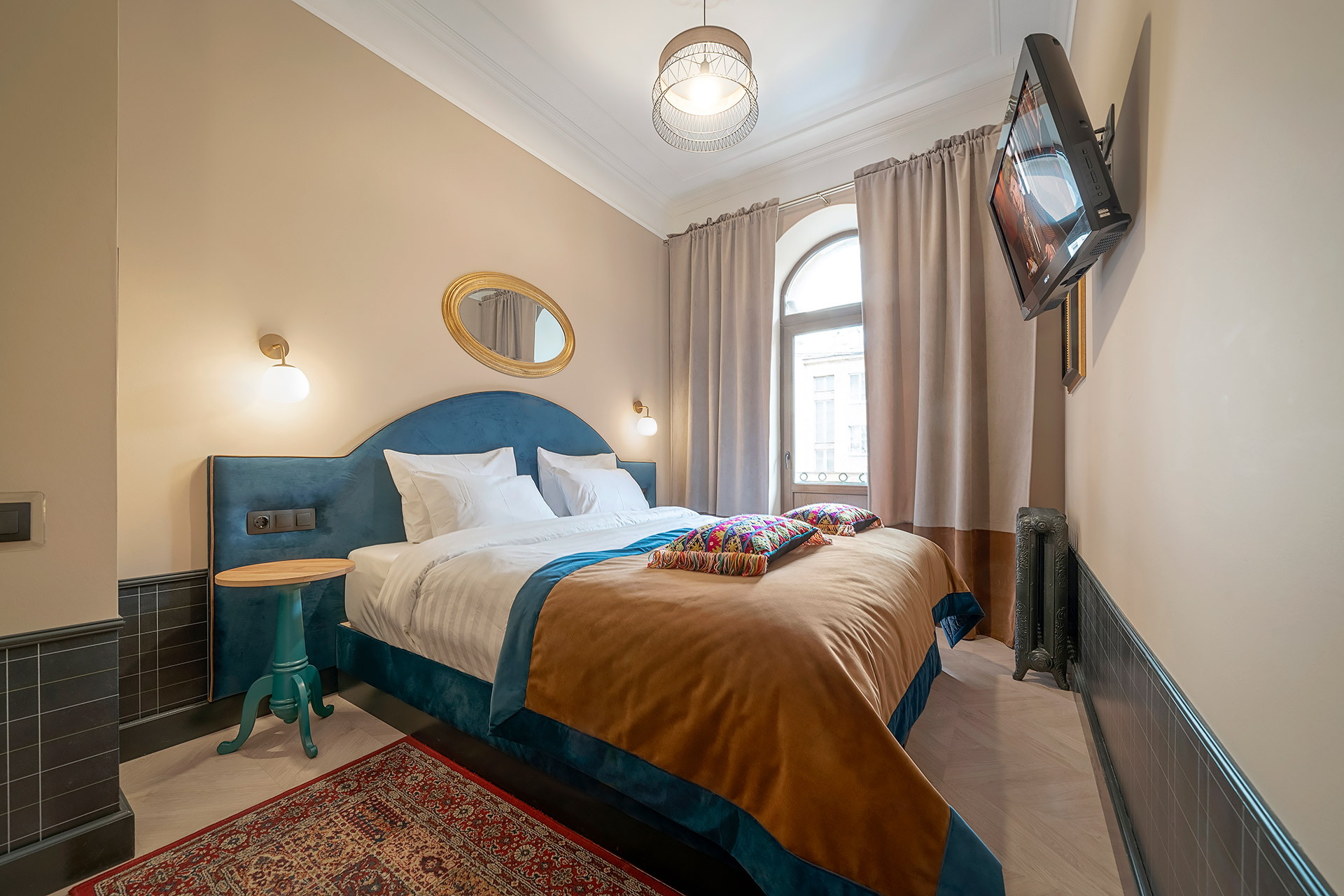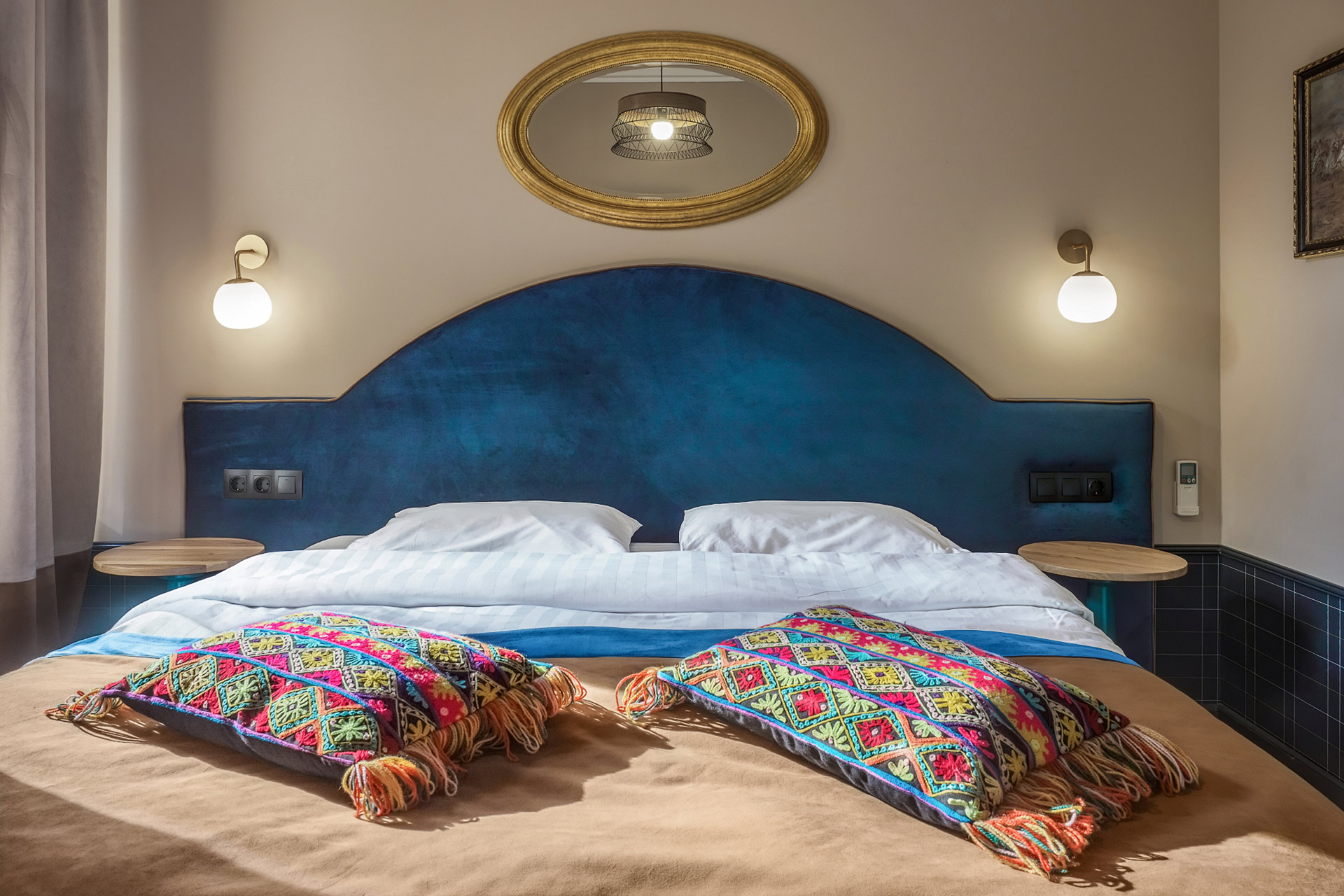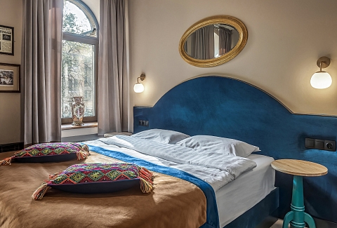 В номере: вешалка, зеркало, кресло-кровать, кровать двуспальная, прикроватные тумбочки, стол, шкаф, кондиционер, телевизор