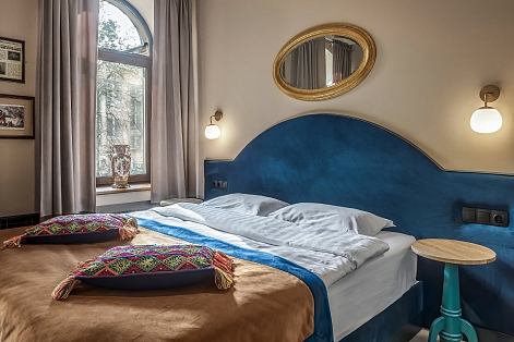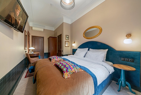 В номере: вешалка, зеркало, кресла, кровать двуспальная, прикроватные тумбочки, стол, шкаф, кондиционер, телевизор