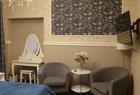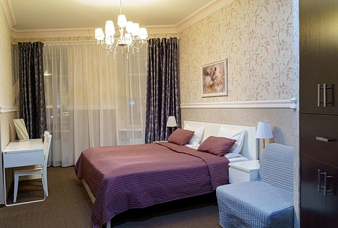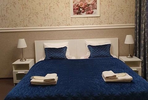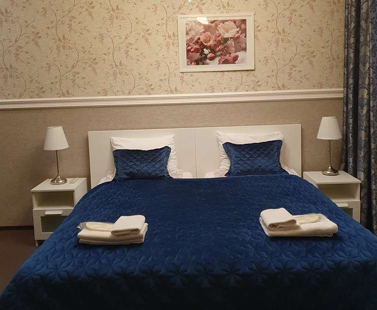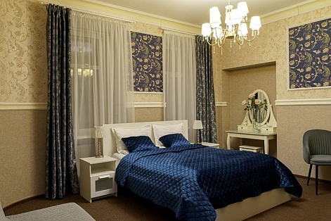 В номере: вешалка, диван, зеркало, кровать двуспальная, прикроватные тумбочки, стол, стулья, шкаф, мини-холодильник, телевизор