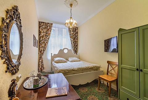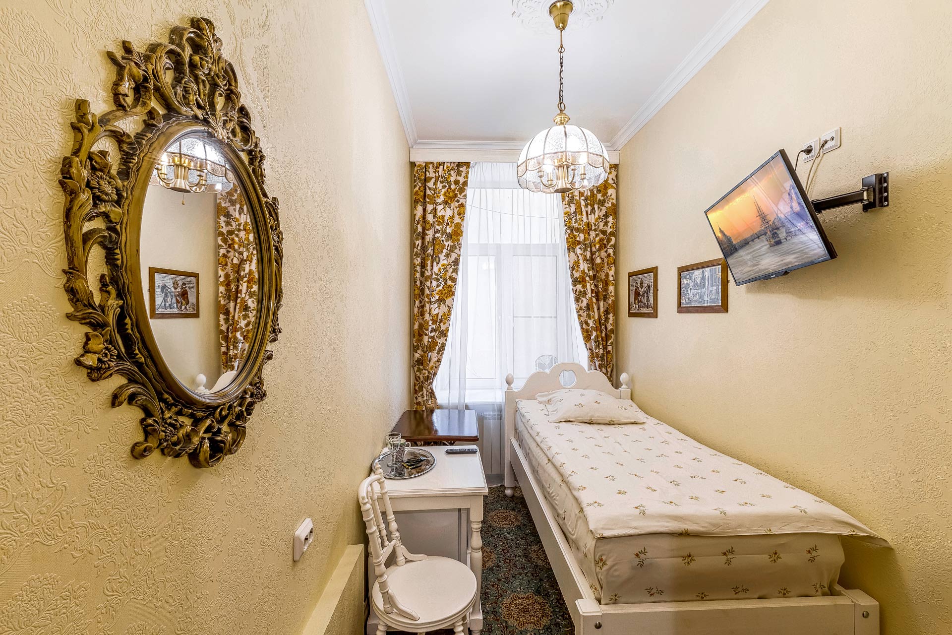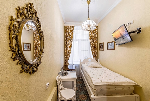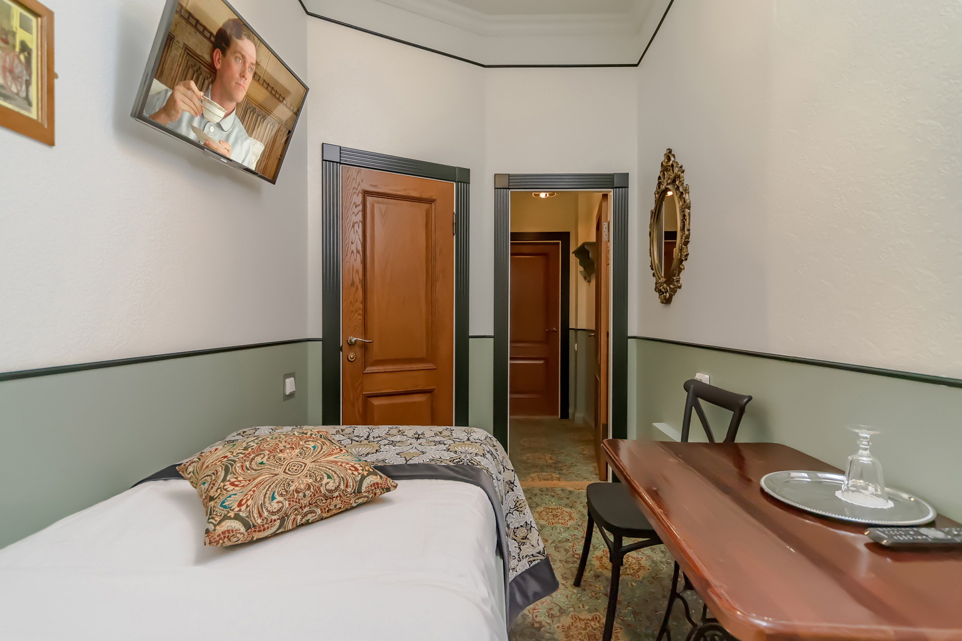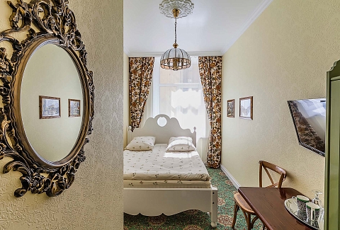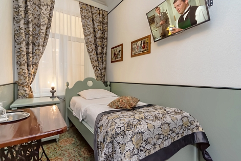 В номере: вешалка, зеркало, кровать односпальная, стол, стул, шкаф, мини-холодильник, телевизор