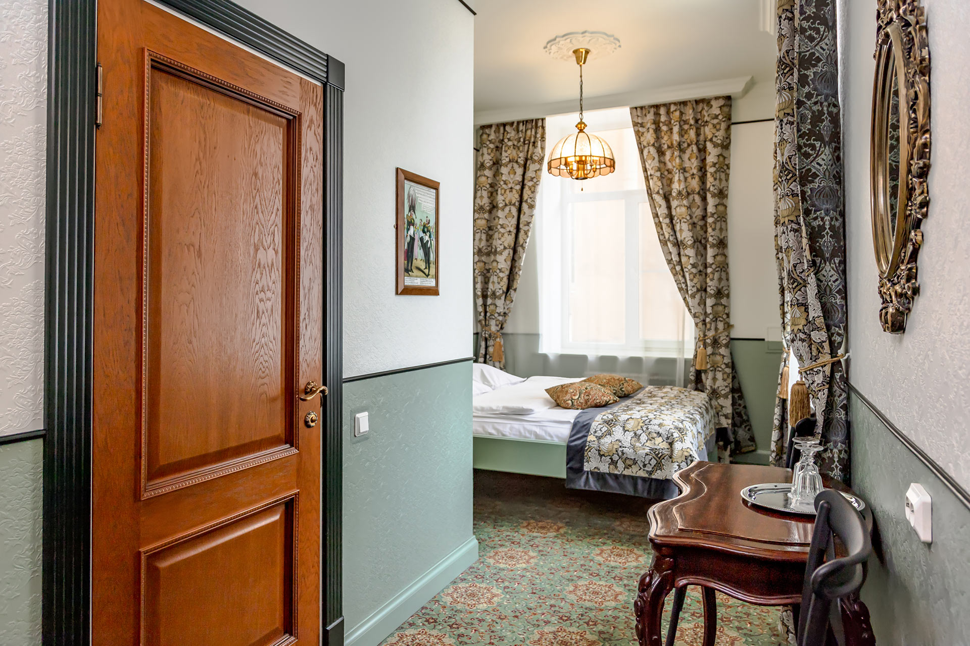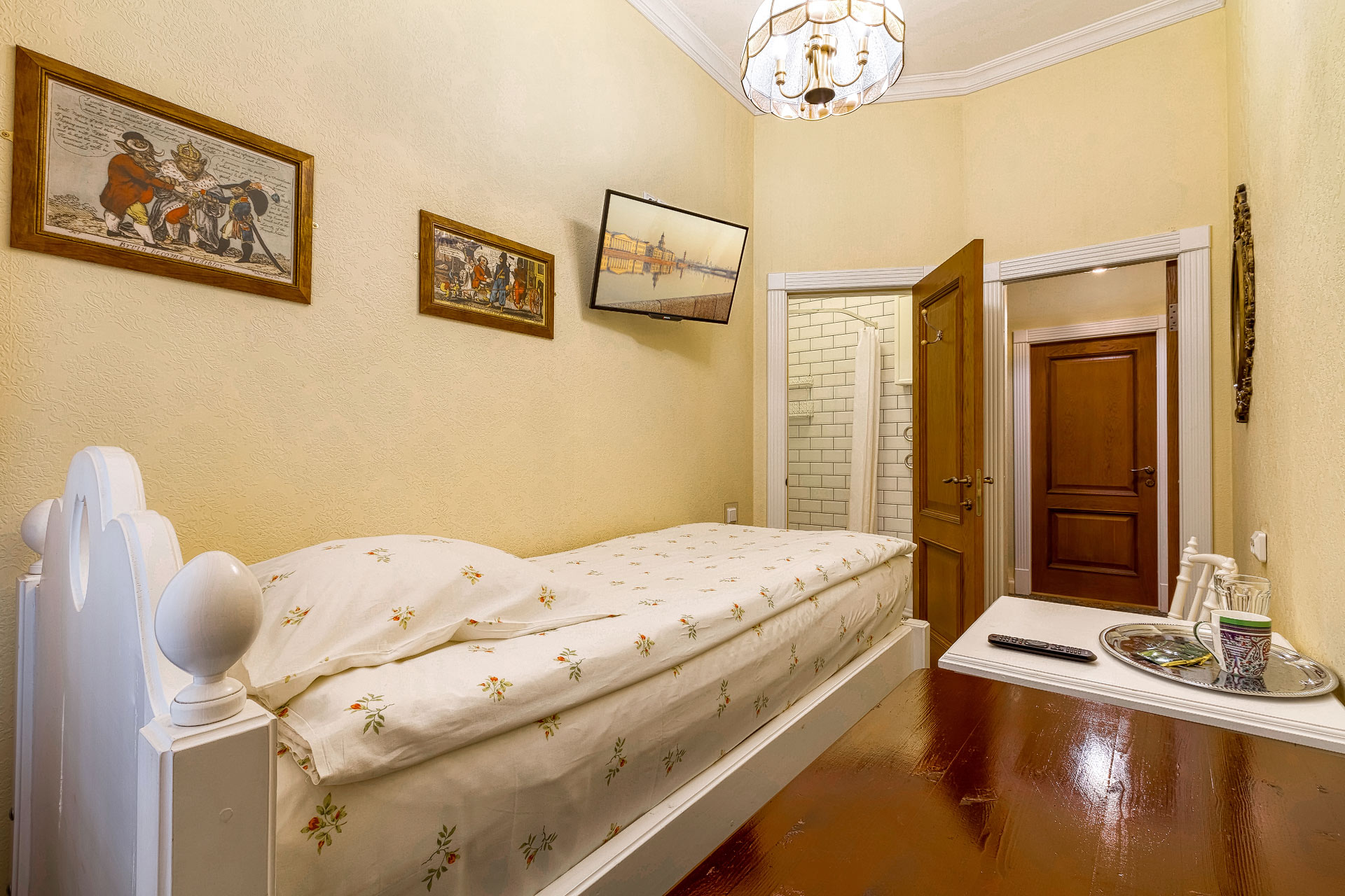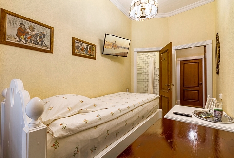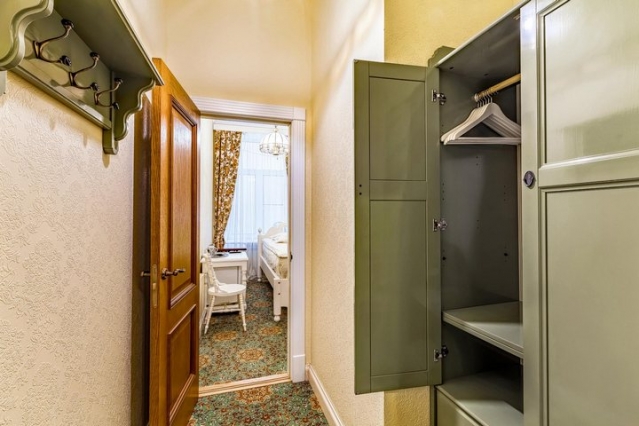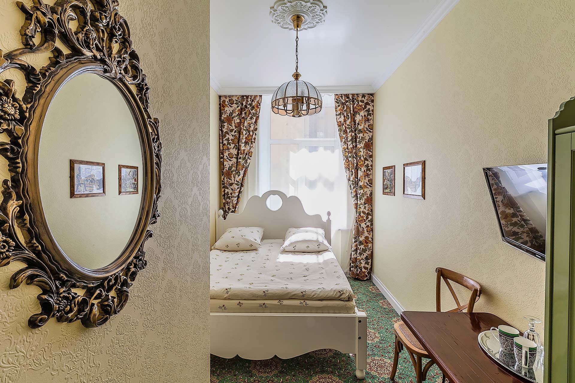 В номере: вешалка, зеркало, кровать односпальная, стол, стул, шкаф, мини-холодильник, телевизор