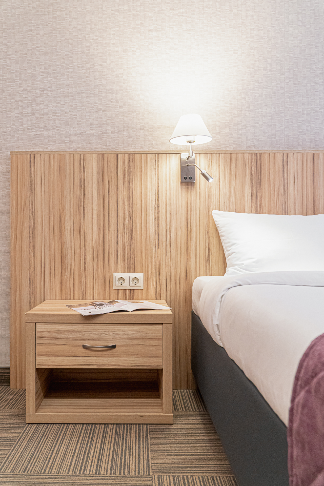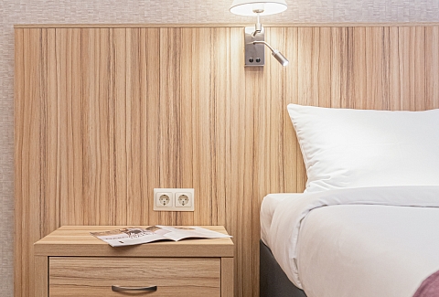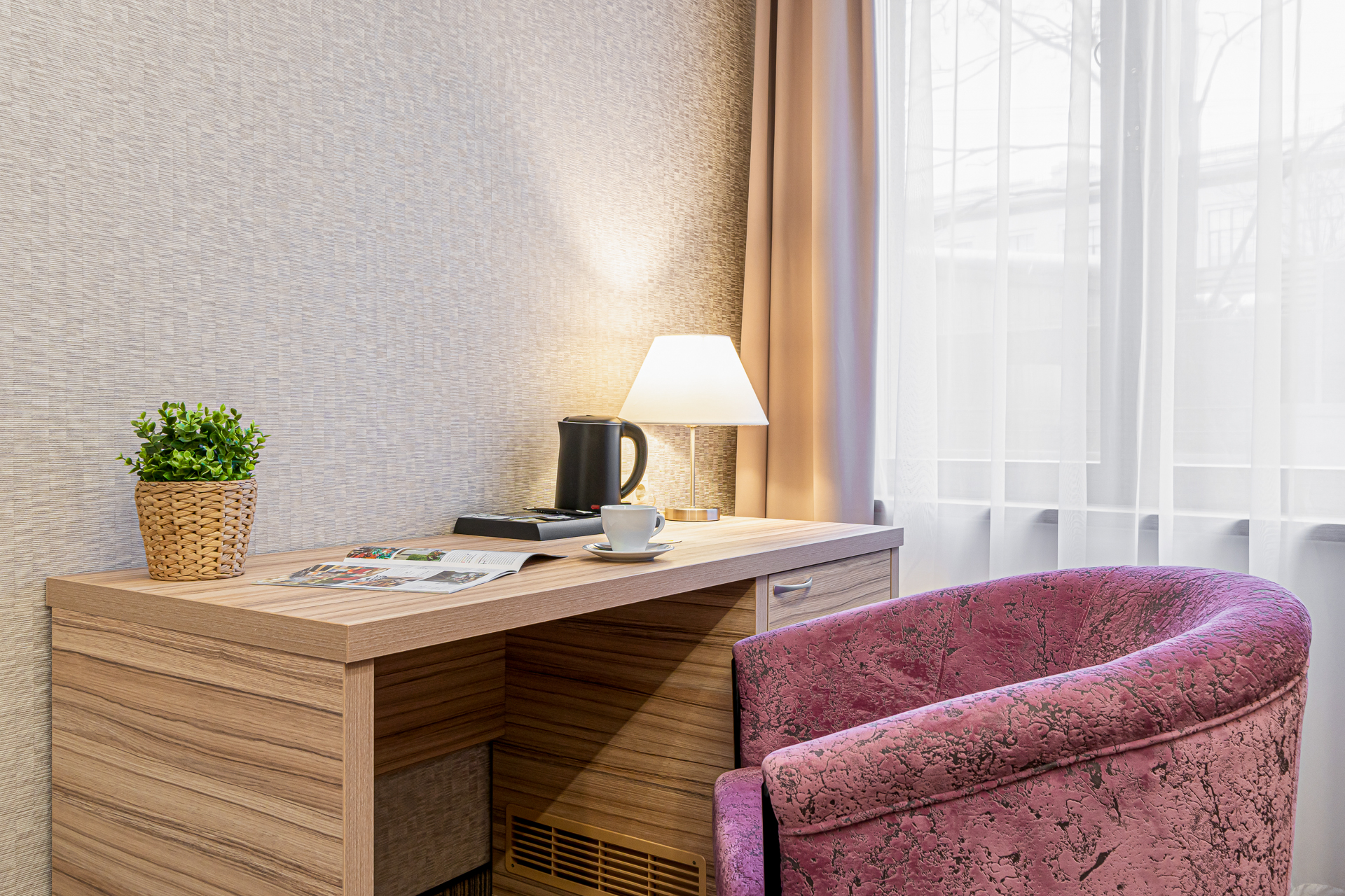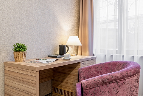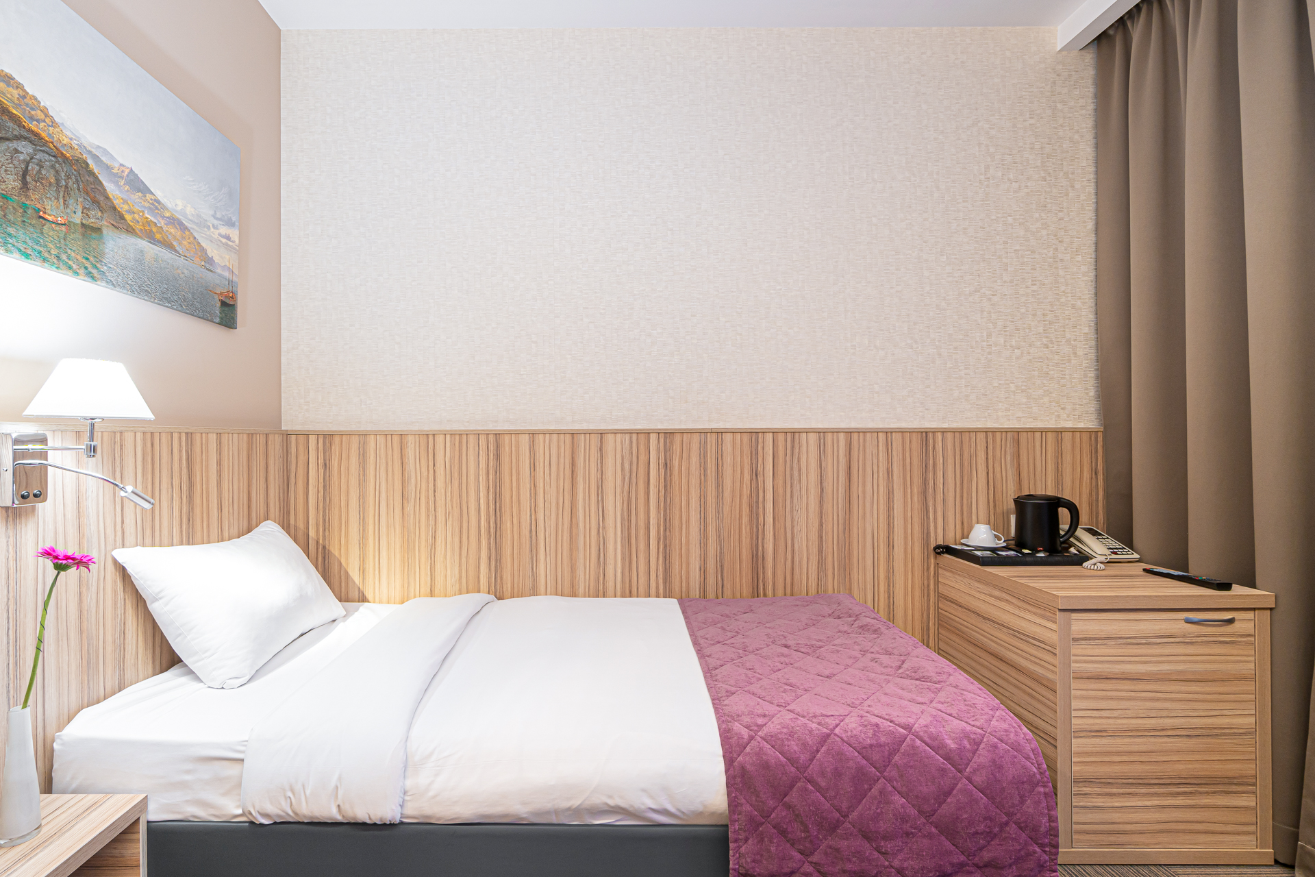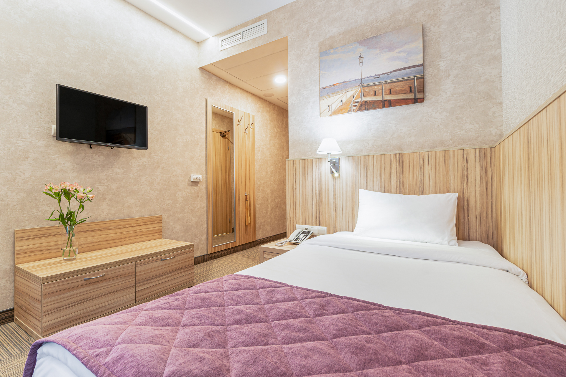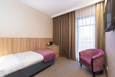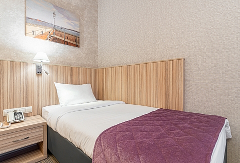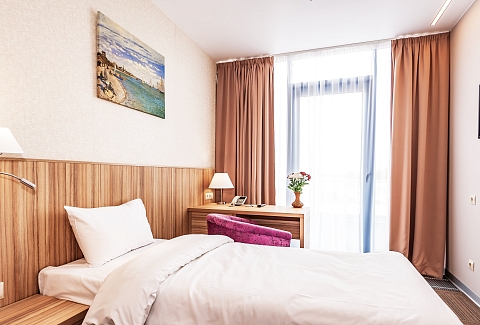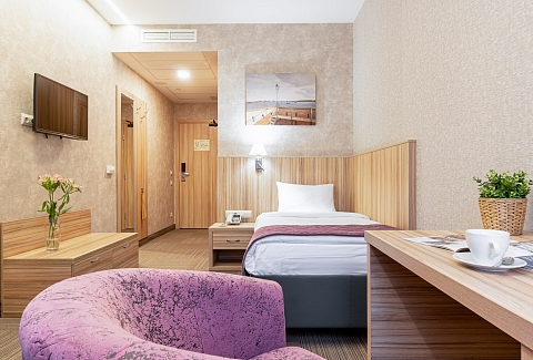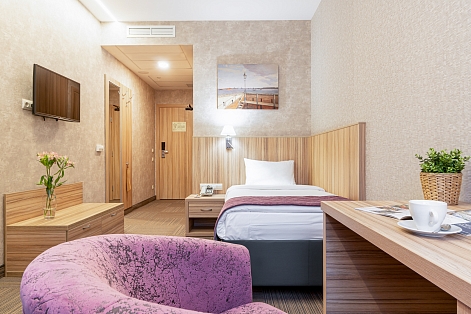 В номере: кресло, кровать односпальная, прикроватная тумбочка, стол, шкаф, кондиционер, мини-холодильник, сейф, телевизор, чайная станция