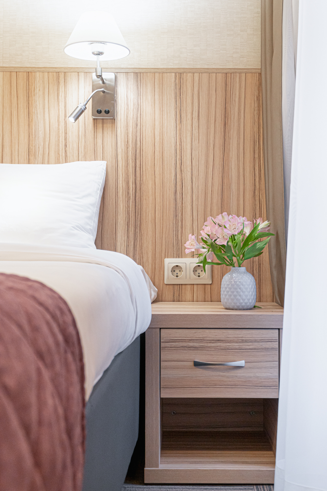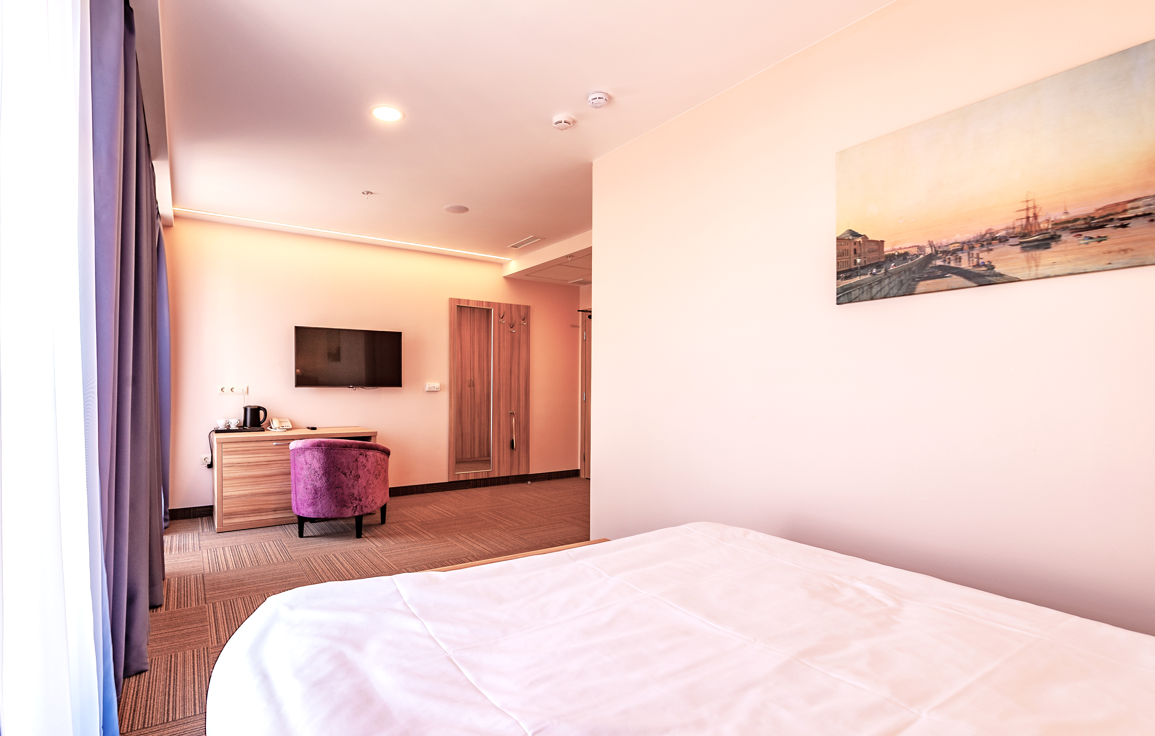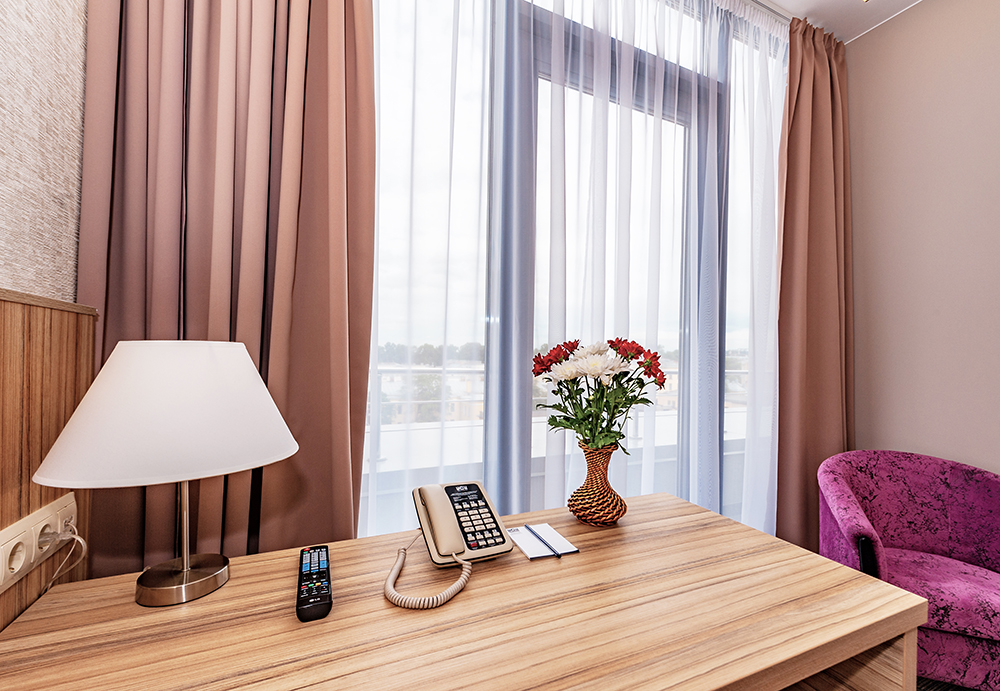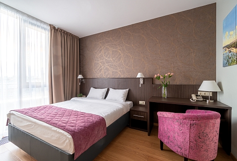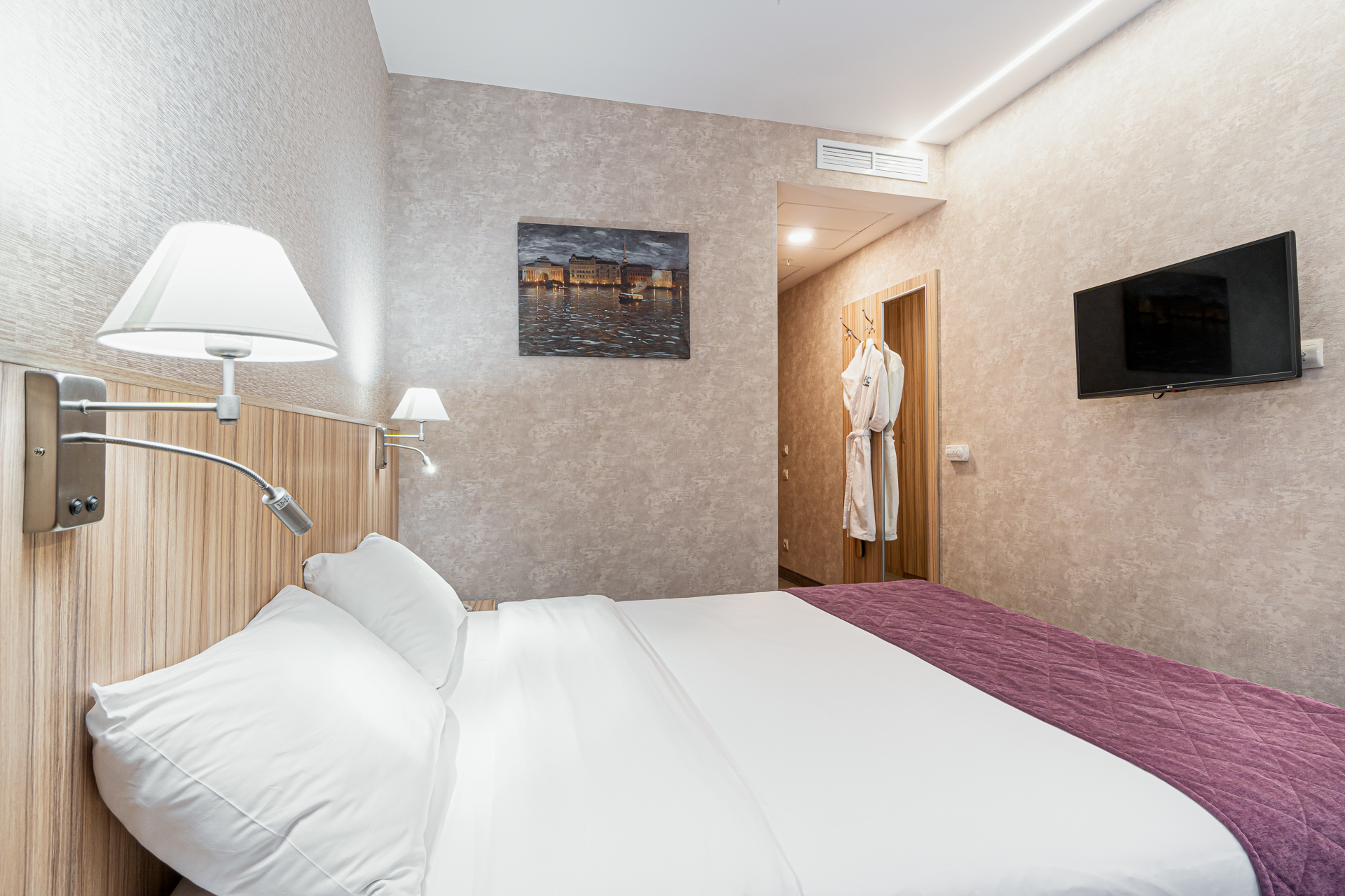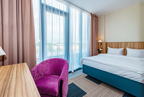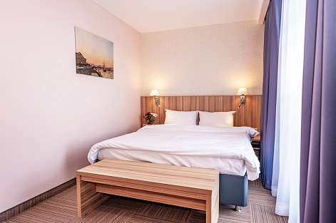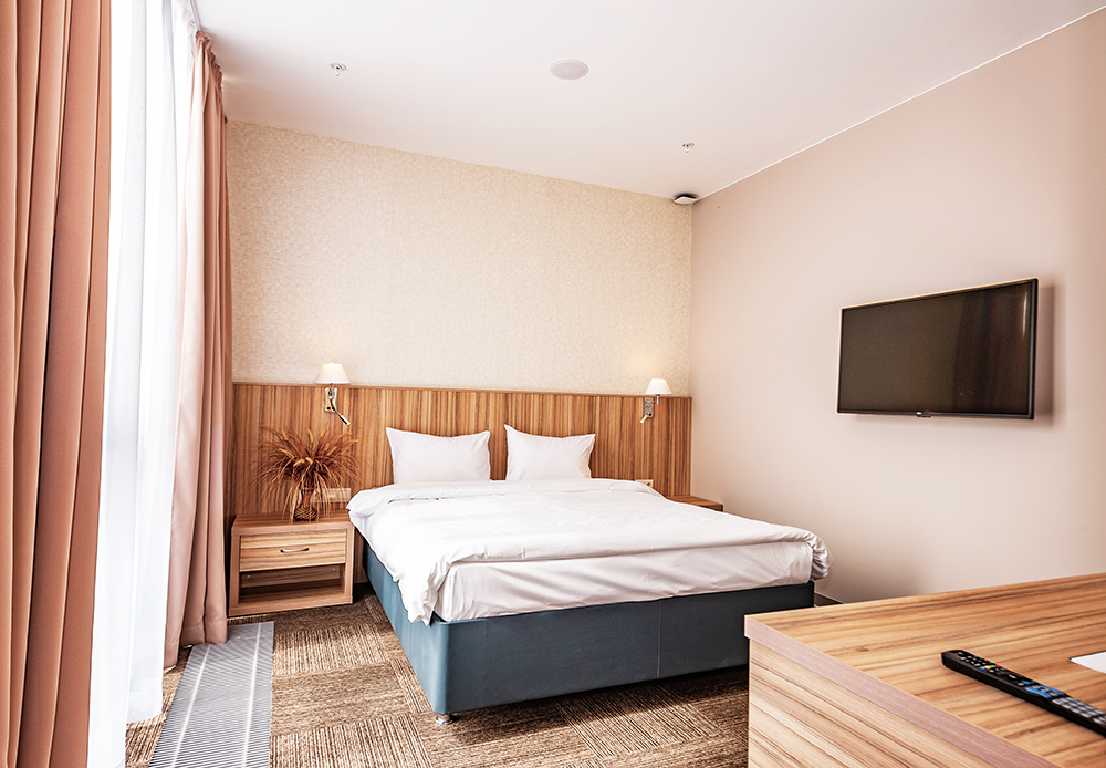 В номере: кровать двуспальная, прикроватные тумбочки, стол, стулья, шкаф, кондиционер, мини-холодильник, сейф, телевизор, чайная станция