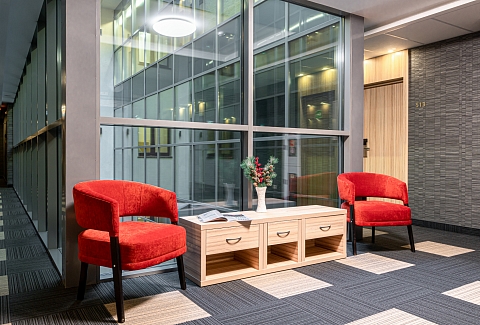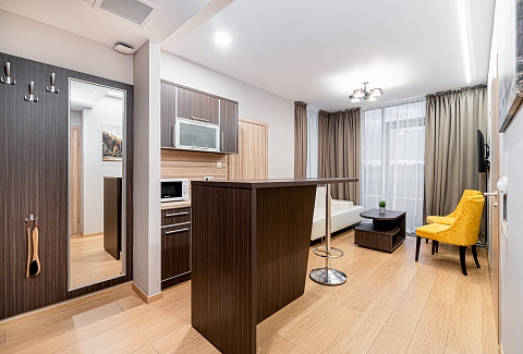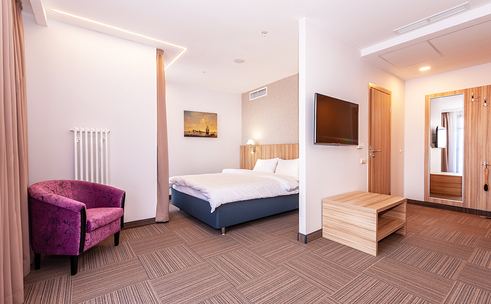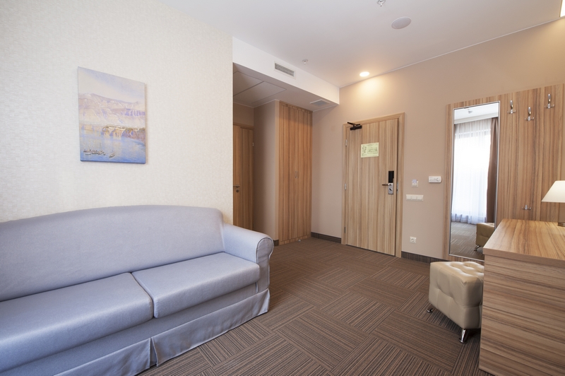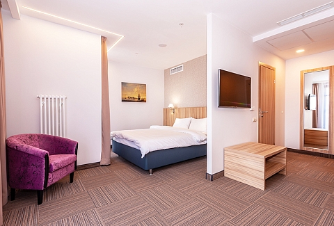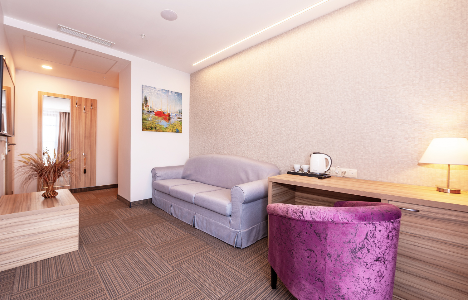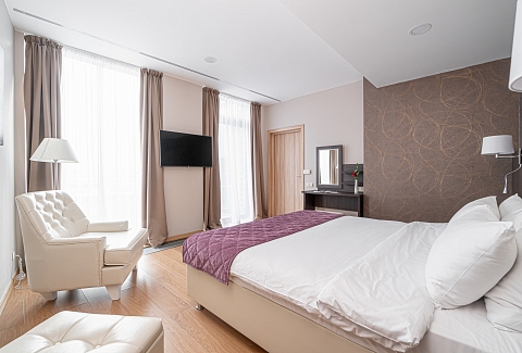 В номере: диван, зеркало, кресло, кровать двуспальная, стол, шкаф, кондиционер, мини-холодильник, сейф, телевизор, чайная станция