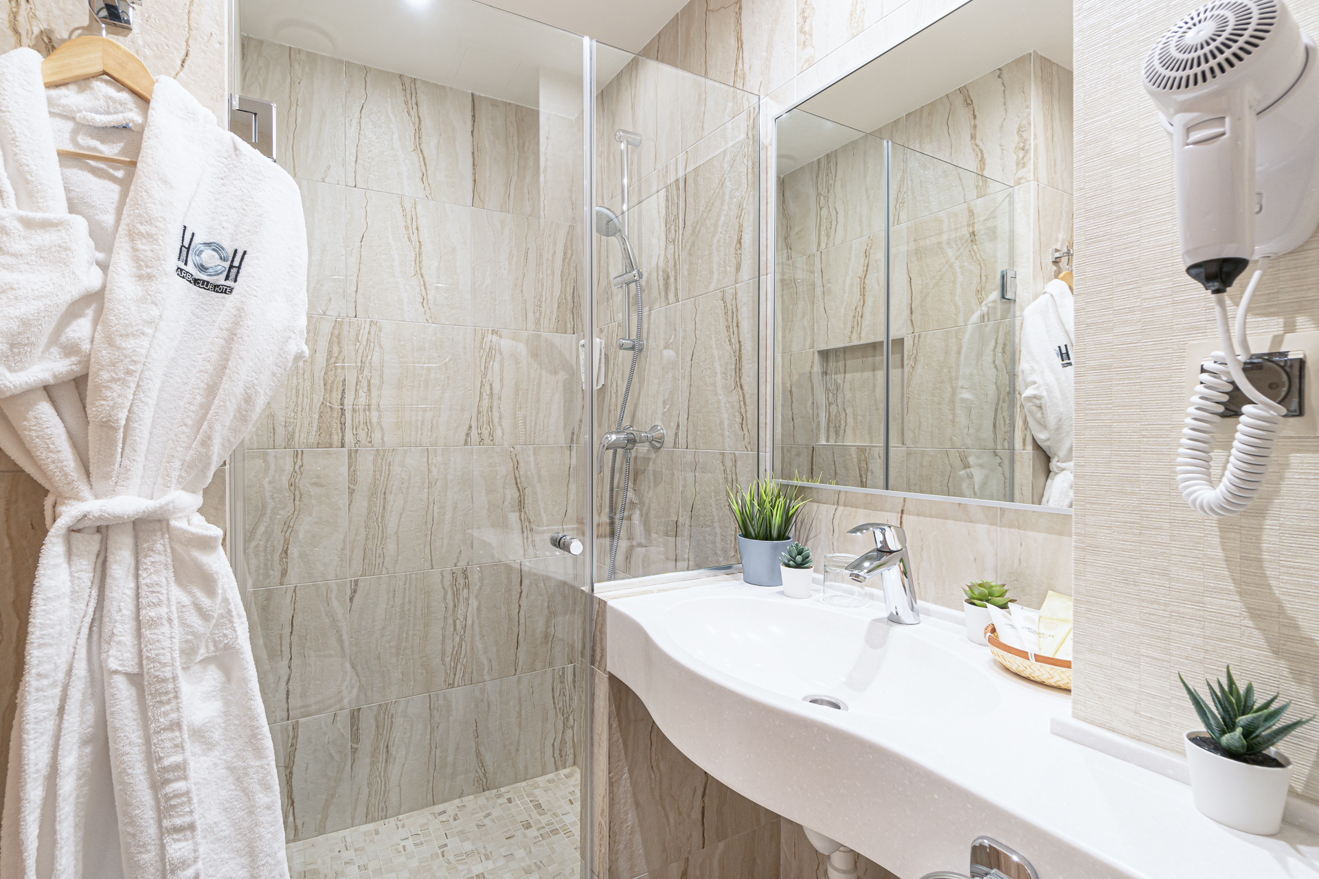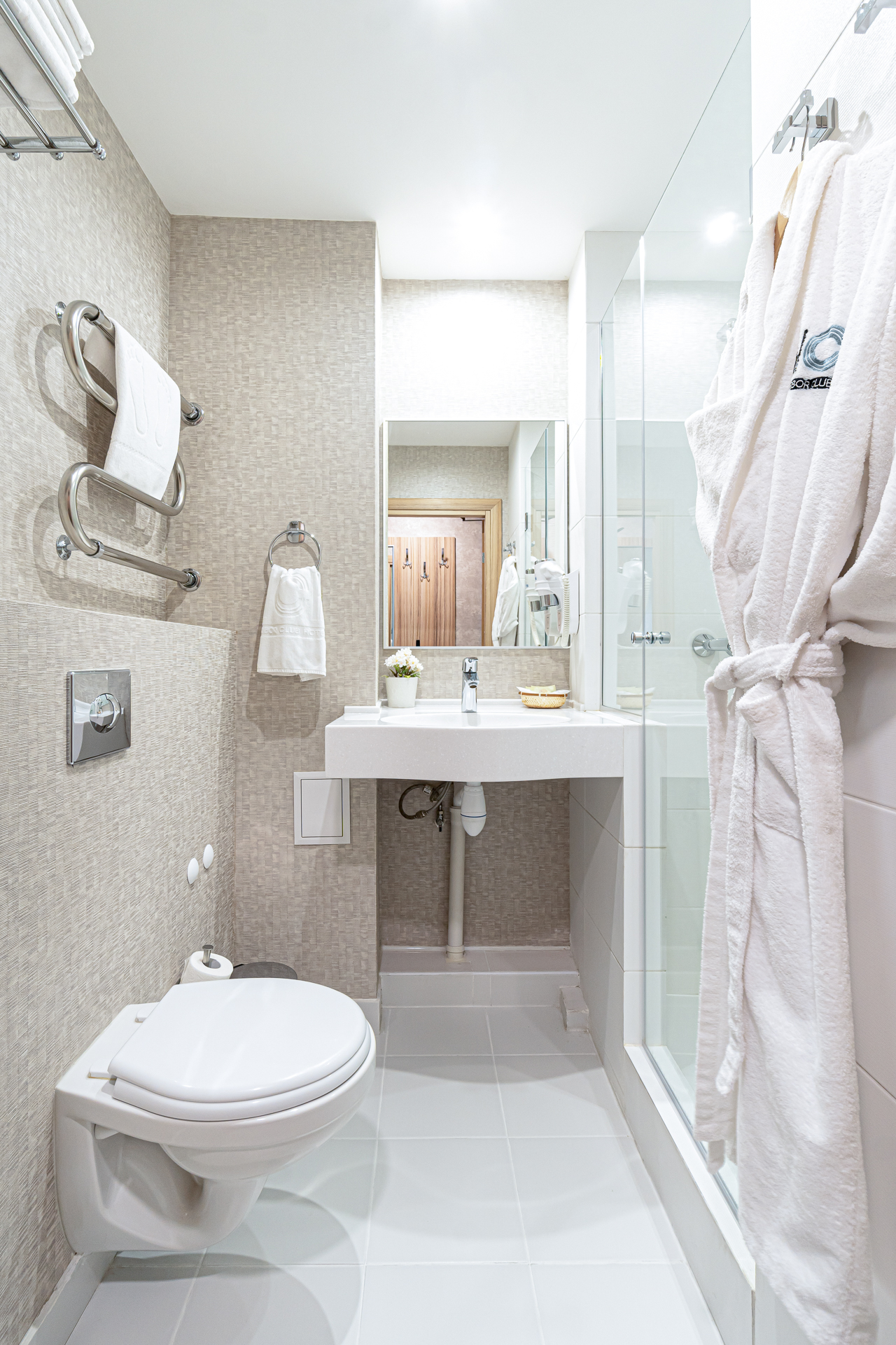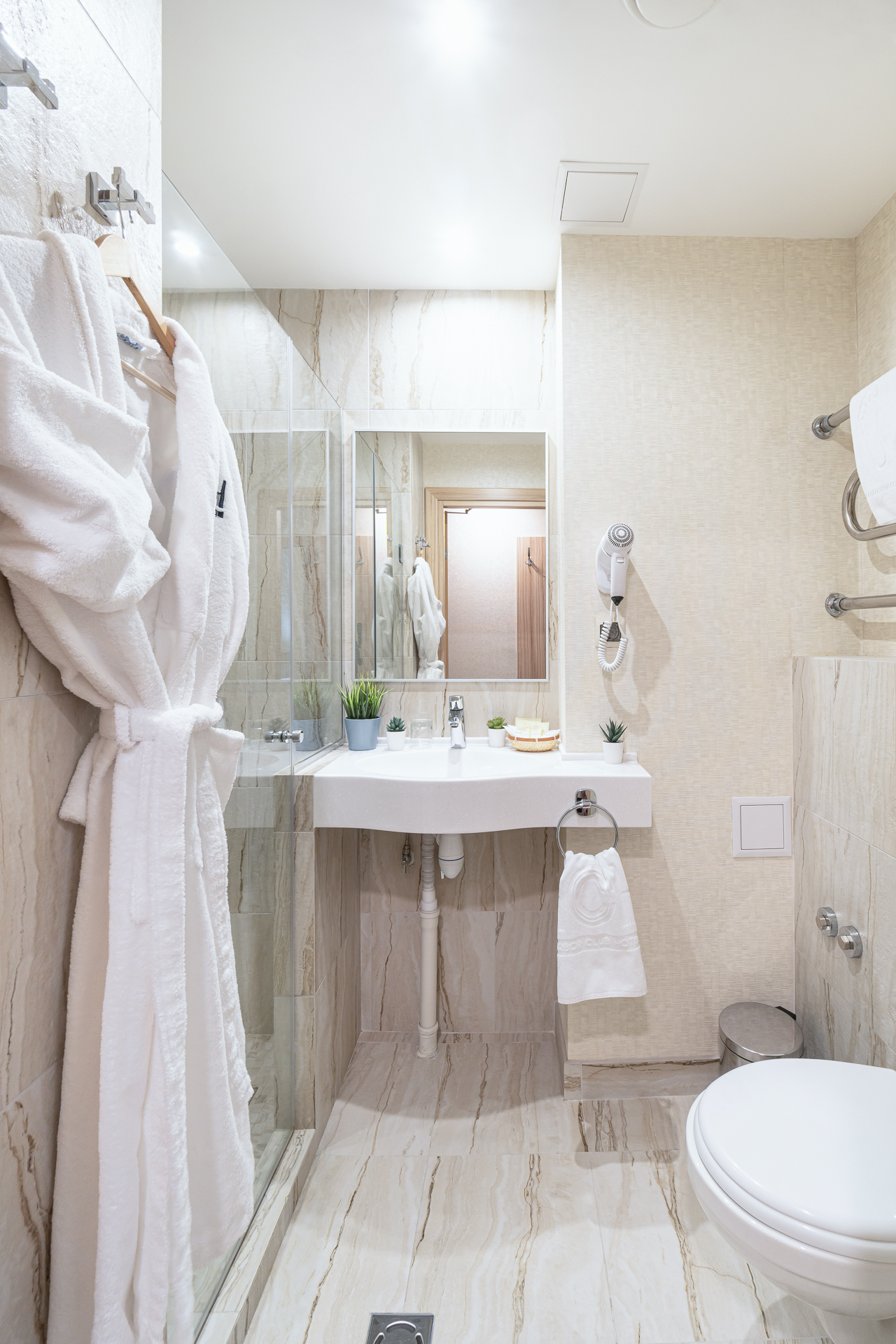 Санузел: с душем, тапочки, туалетные принадлежности, фен, халат