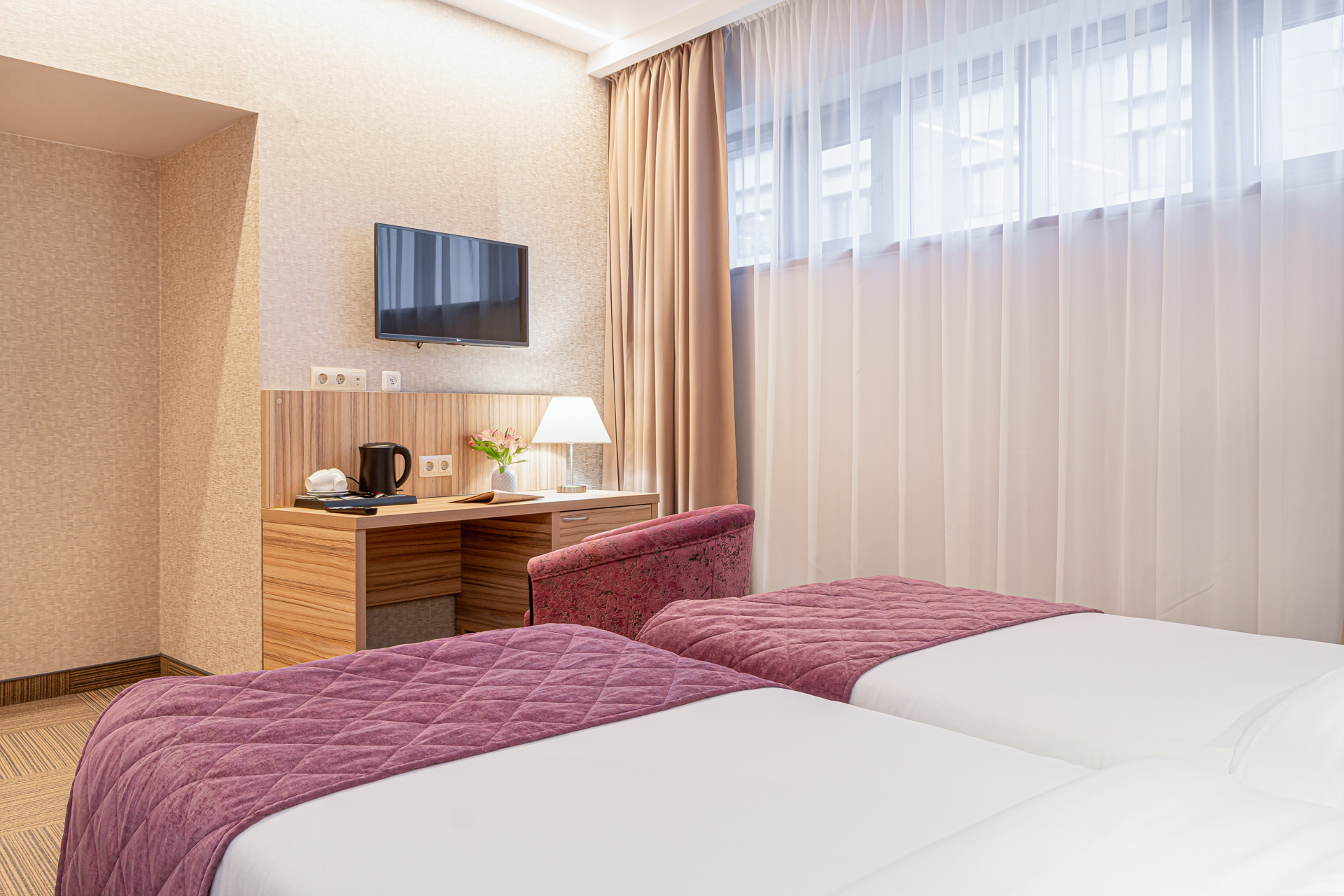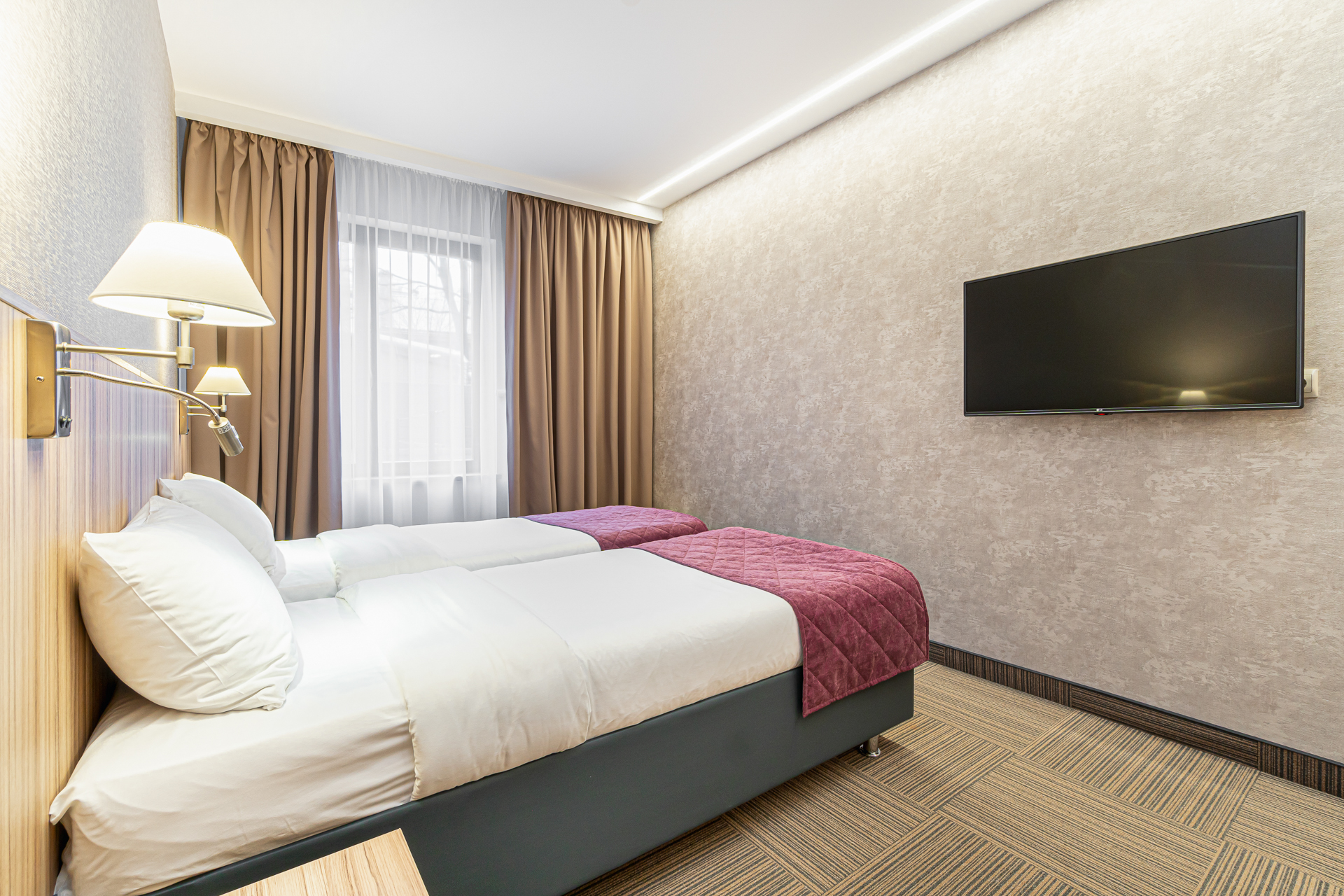 В номере: кровати односпальные /одна двуспальная кровать, стол, кондиционер, мини-холодильник, сейф, телевизор, чайная станция