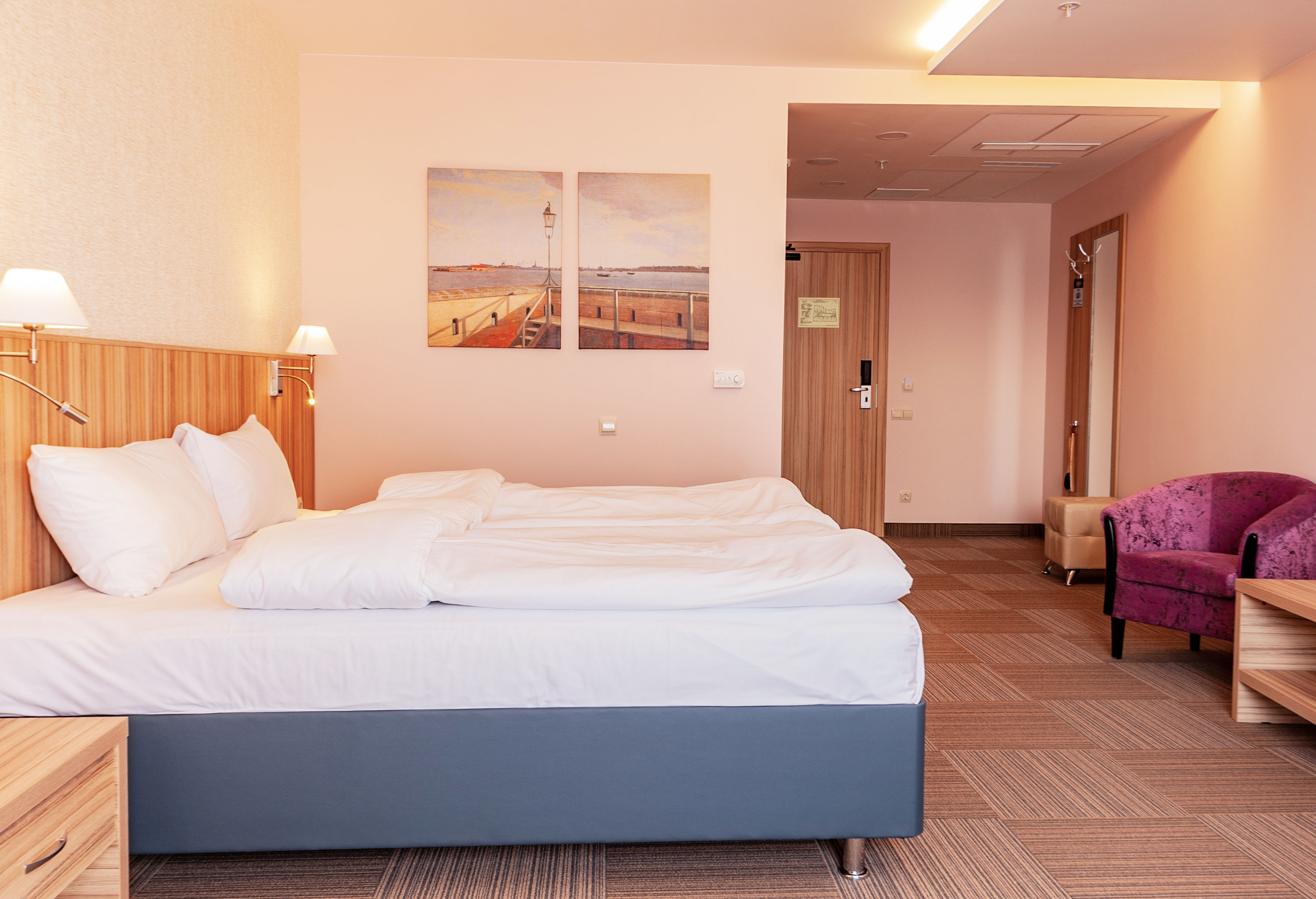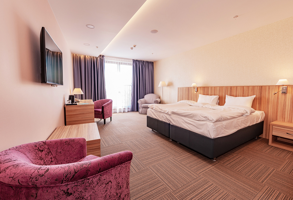 В номере: кресла, кровать двуспальная, кровать односпальная, прикроватные тумбочки, стол, стулья, шкаф, кондиционер, мини-холодильник, сейф, телевизор, чайная станция