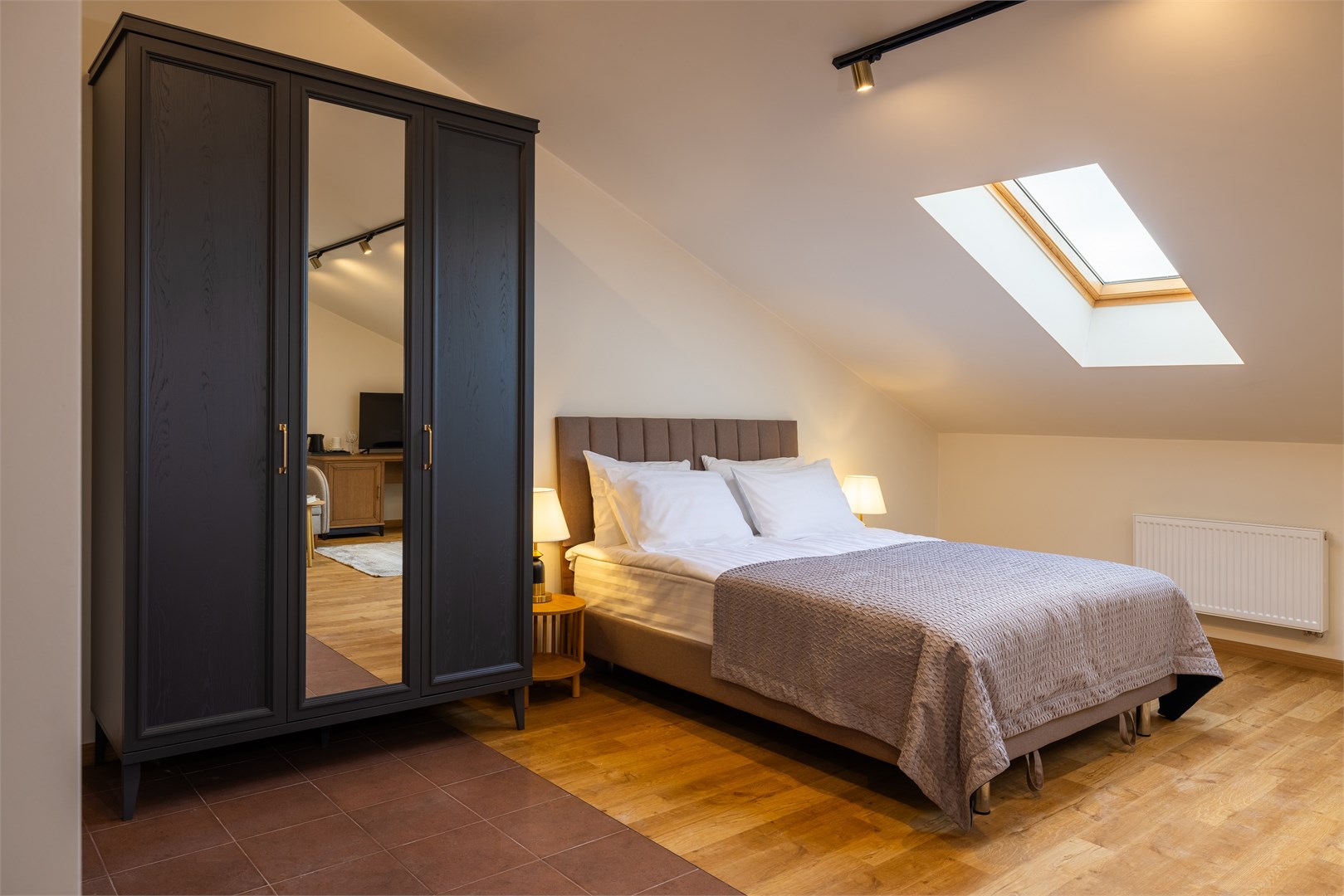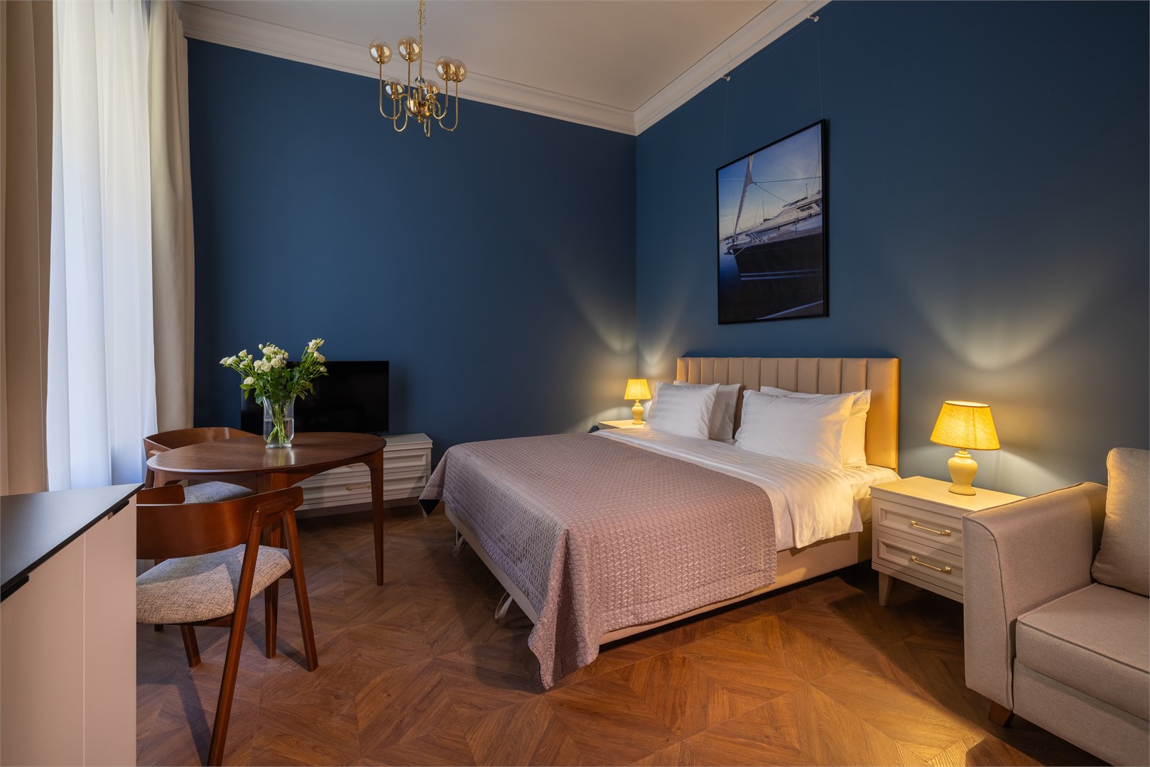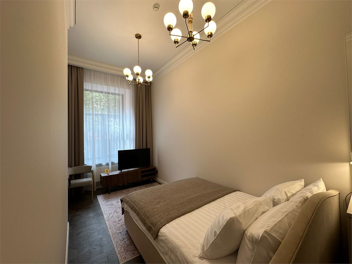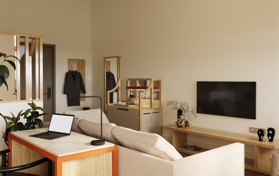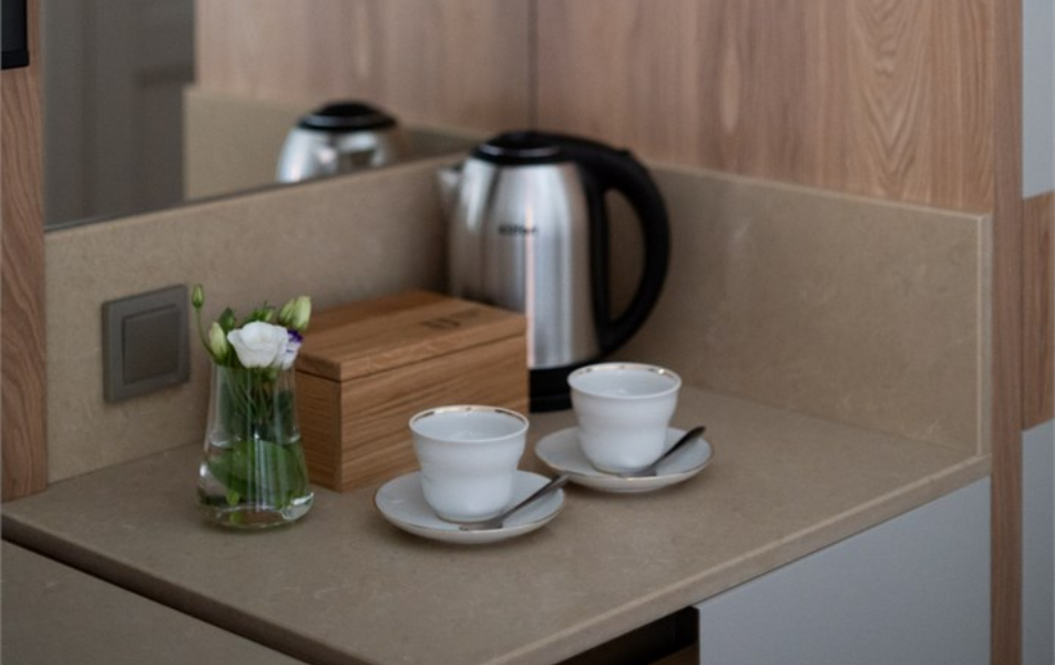 В номере: вешалка, диван, зеркало, кровать двуспальная, прикроватные тумбочки, стол, стулья, шкаф, кондиционер, мини-холодильник, сейф, телевизор, телефон, утюг, чайная станция, чайный набор посуды