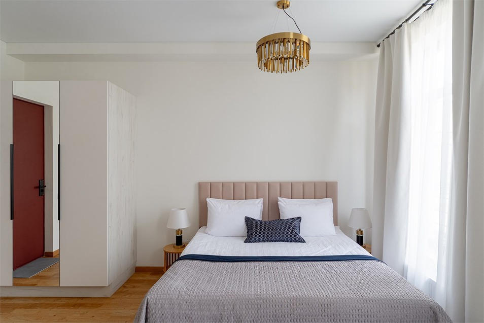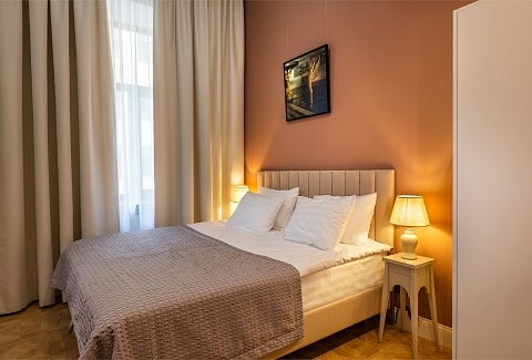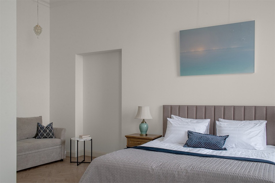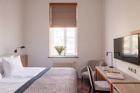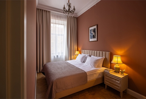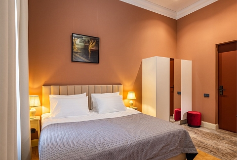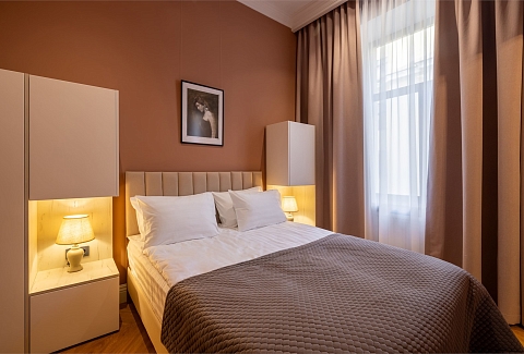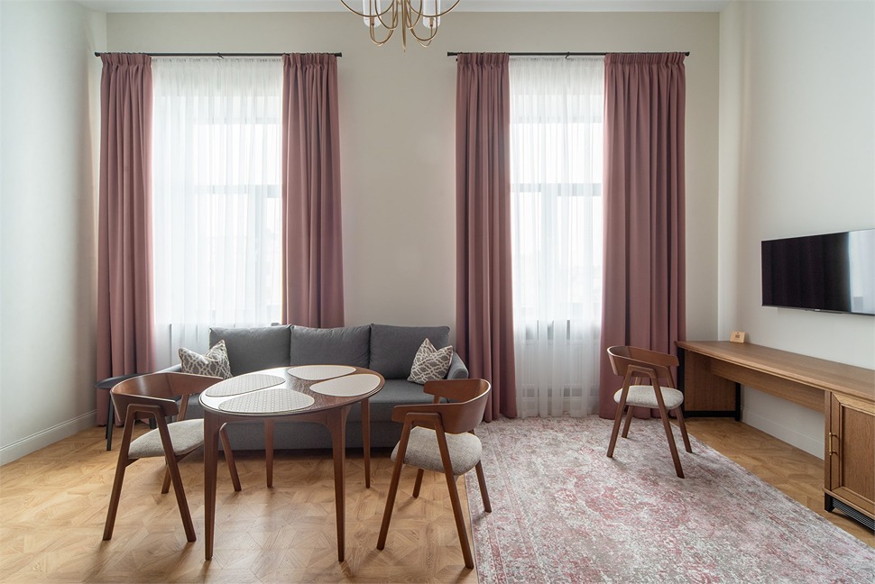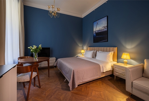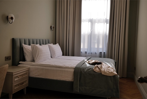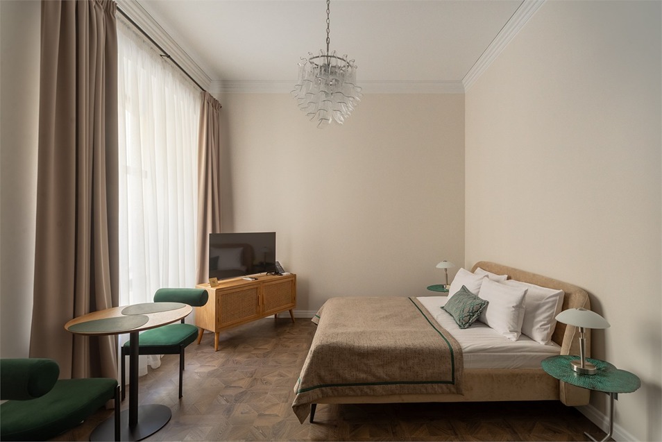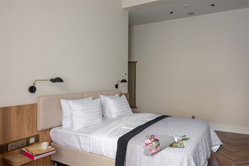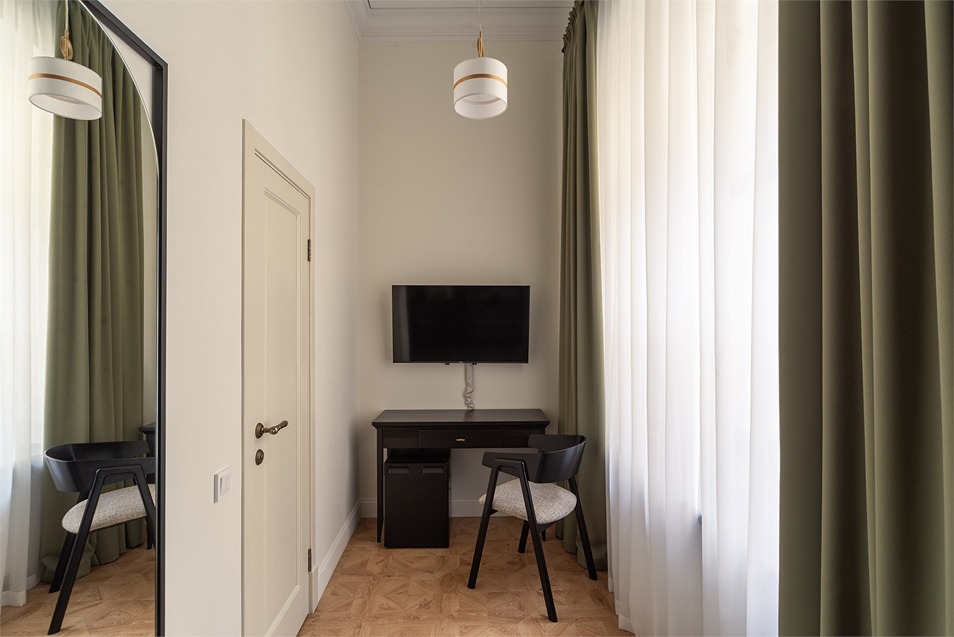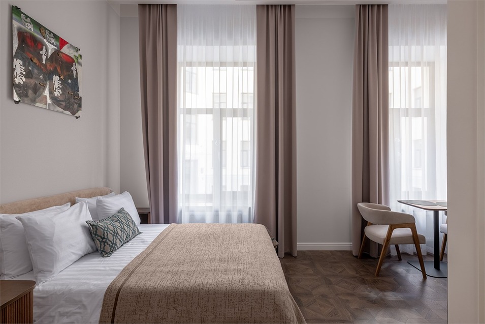 В номерах – лаконичные стильные интерьеры, дизайнерская мебель, оборудованная кухня со столовой зоной, кондиционер. Из окон некоторых номеров открываются виды на Никольский собор.В отеле работает лобби-бар, в распоряжении отдыхающих – тренажерный зал, библиотека, среди удобств – безлимитный интернет, а также бизнес-зоны для коворкинга, конференций и прочих деловых мероприятий.