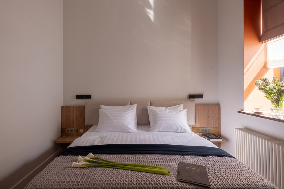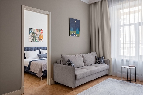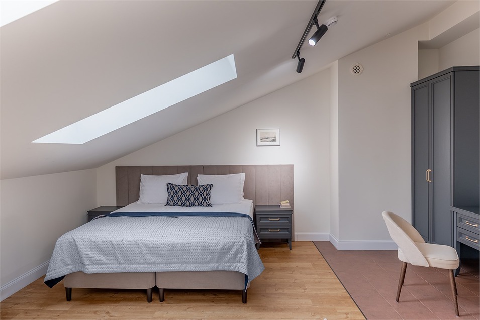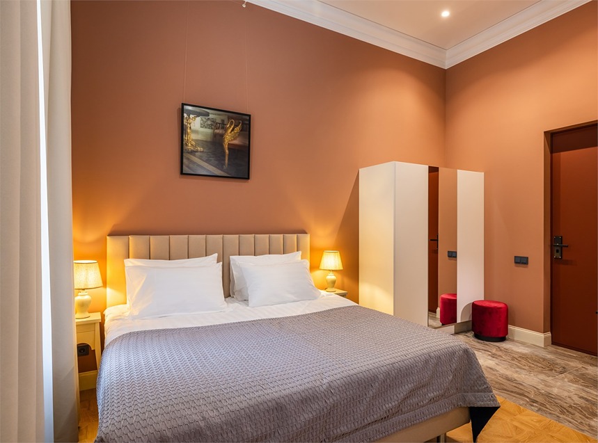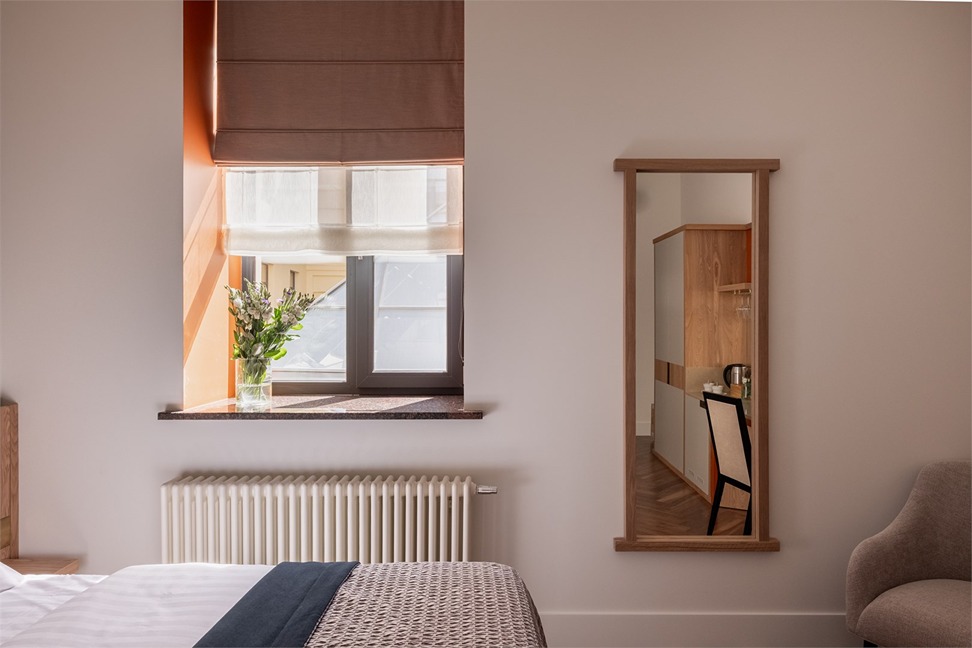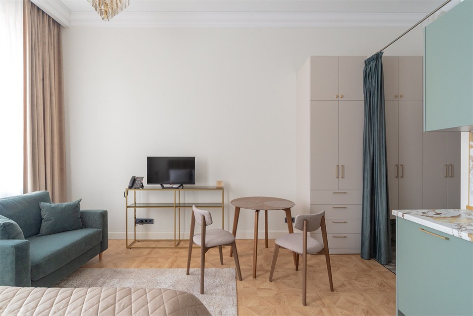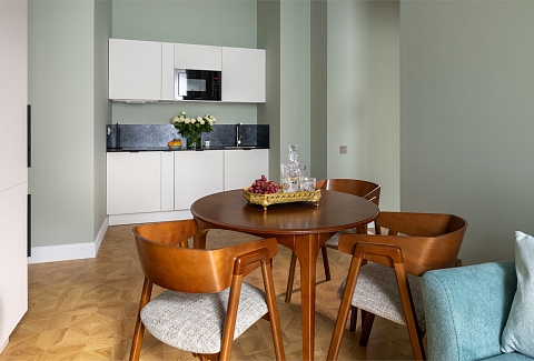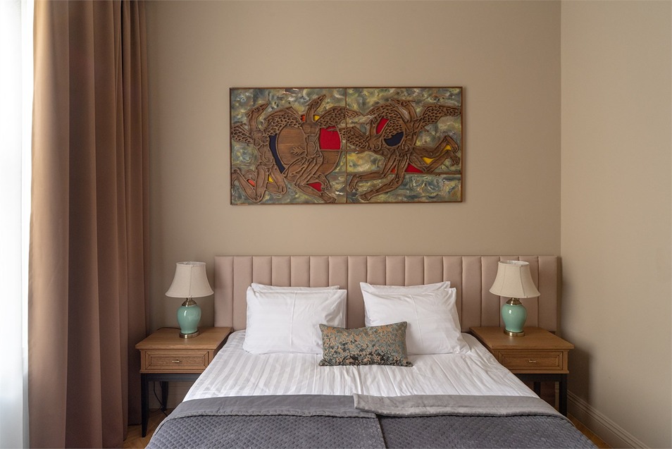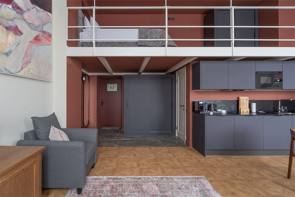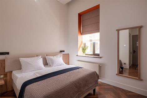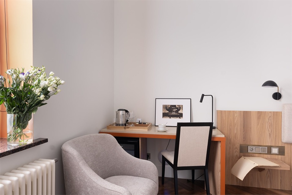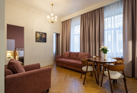 В номерах – лаконичные стильные интерьеры, дизайнерская мебель, оборудованная кухня со столовой зоной, кондиционер. Из окон некоторых номеров открываются виды на Никольский собор.В отеле работает лобби-бар, в распоряжении отдыхающих – тренажерный зал, библиотека, среди удобств – безлимитный интернет, а также бизнес-зоны для коворкинга, конференций и прочих деловых мероприятий.