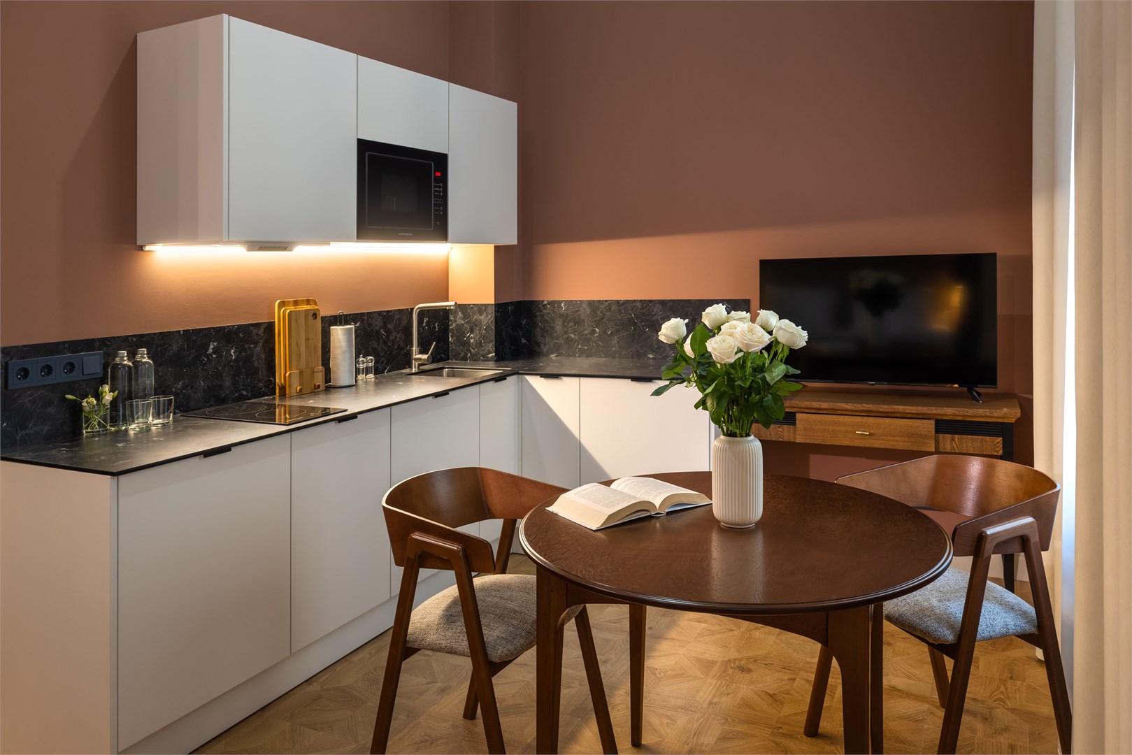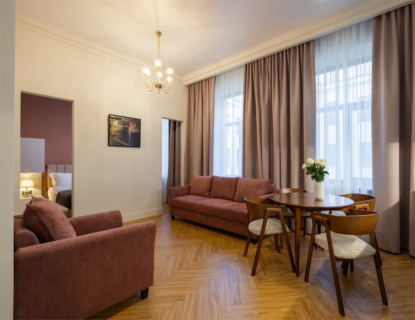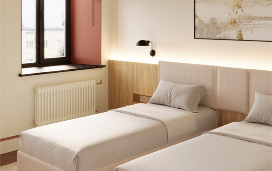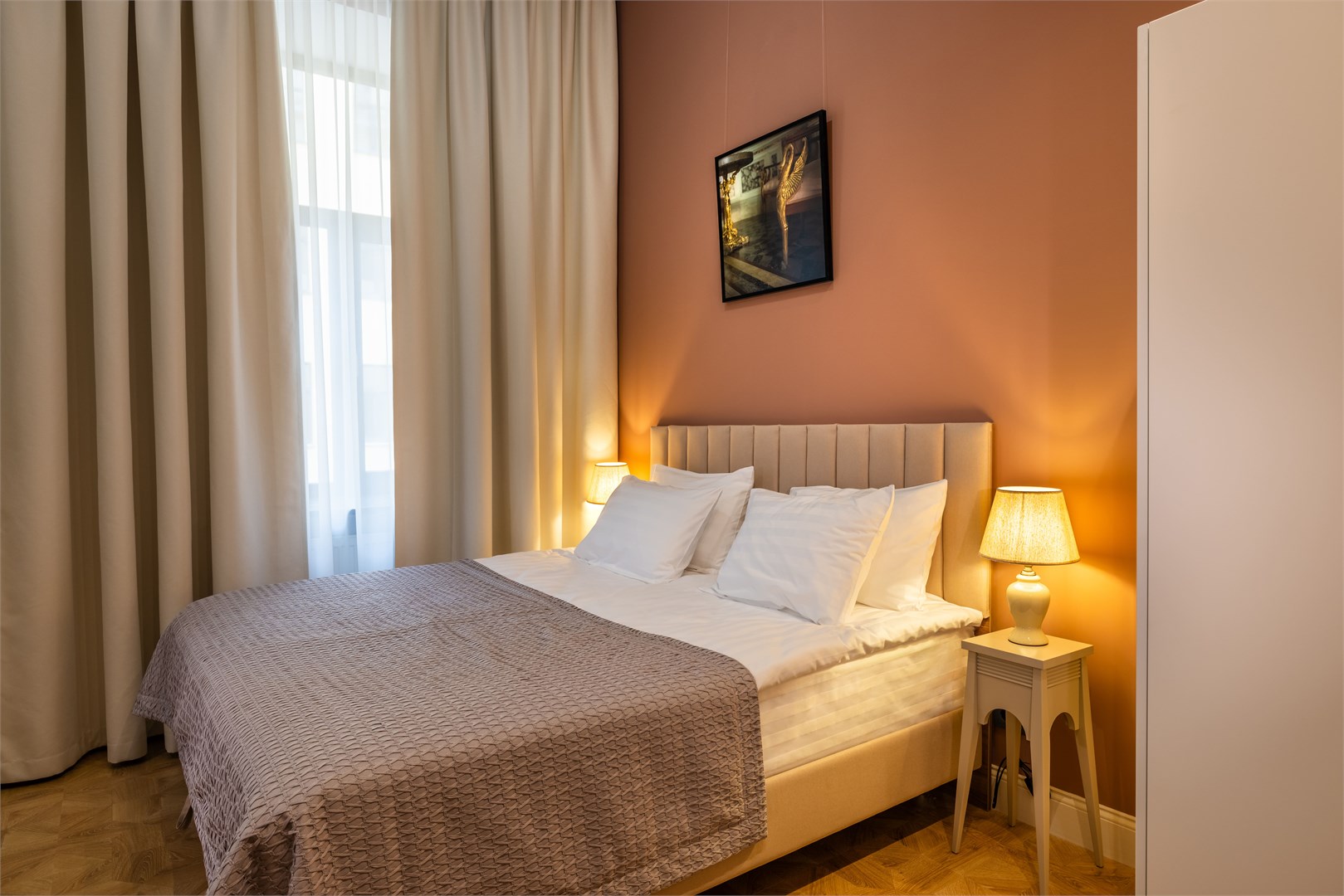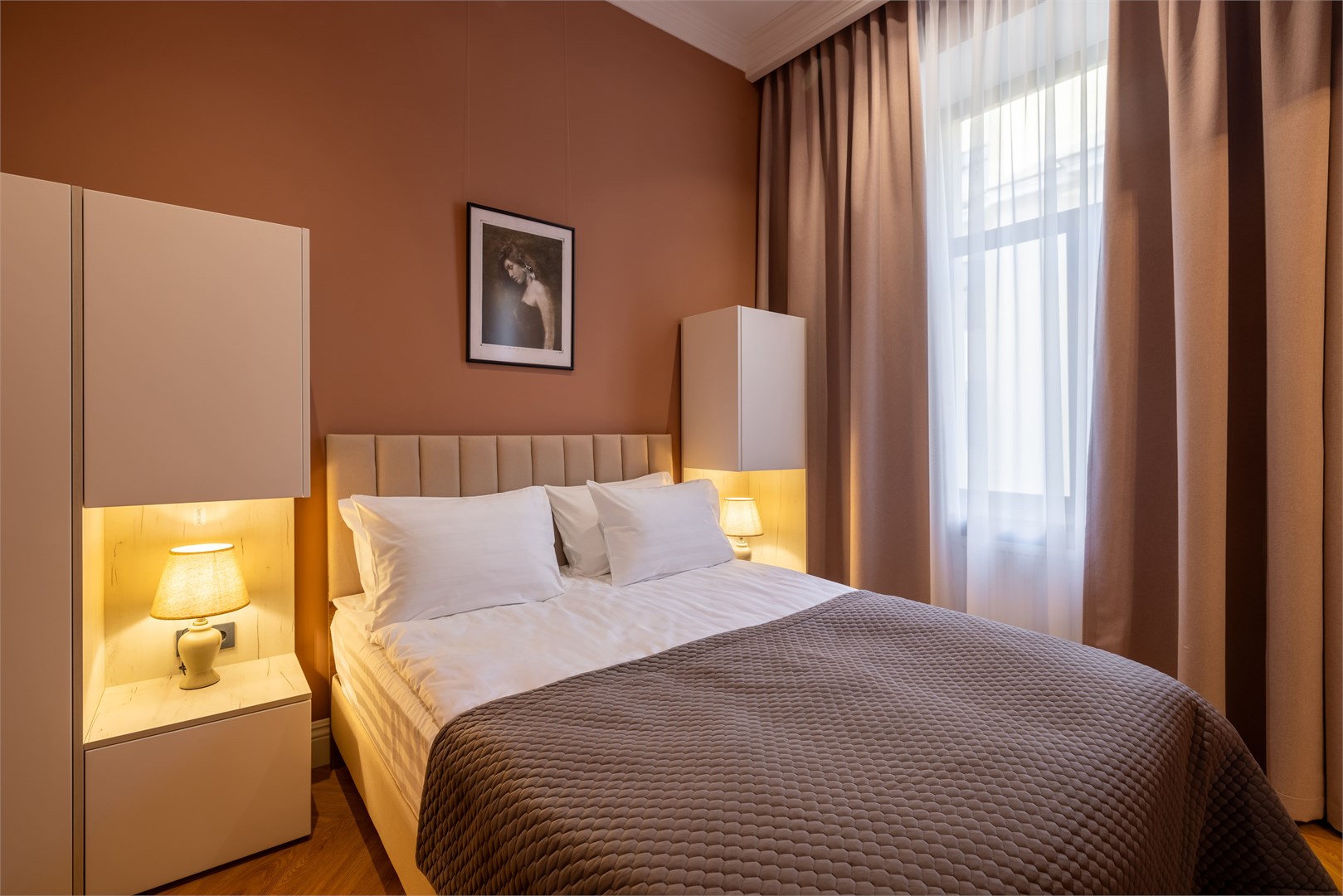 В номерах – лаконичные стильные интерьеры, дизайнерская мебель, оборудованная кухня со столовой зоной, кондиционер. Из окон некоторых номеров открываются виды на Никольский собор.В отеле работает лобби-бар, в распоряжении отдыхающих – тренажерный зал, библиотека, среди удобств – безлимитный интернет, а также бизнес-зоны для коворкинга, конференций и прочих деловых мероприятий.