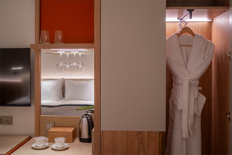 В номере: вешалка, зеркало, кровать двуспальная, прикроватные тумбочки, стол, стул, шкаф, кондиционер, мини-холодильник, сейф, телевизор, телефон, утюг, чайная станция, чайный набор посуды
