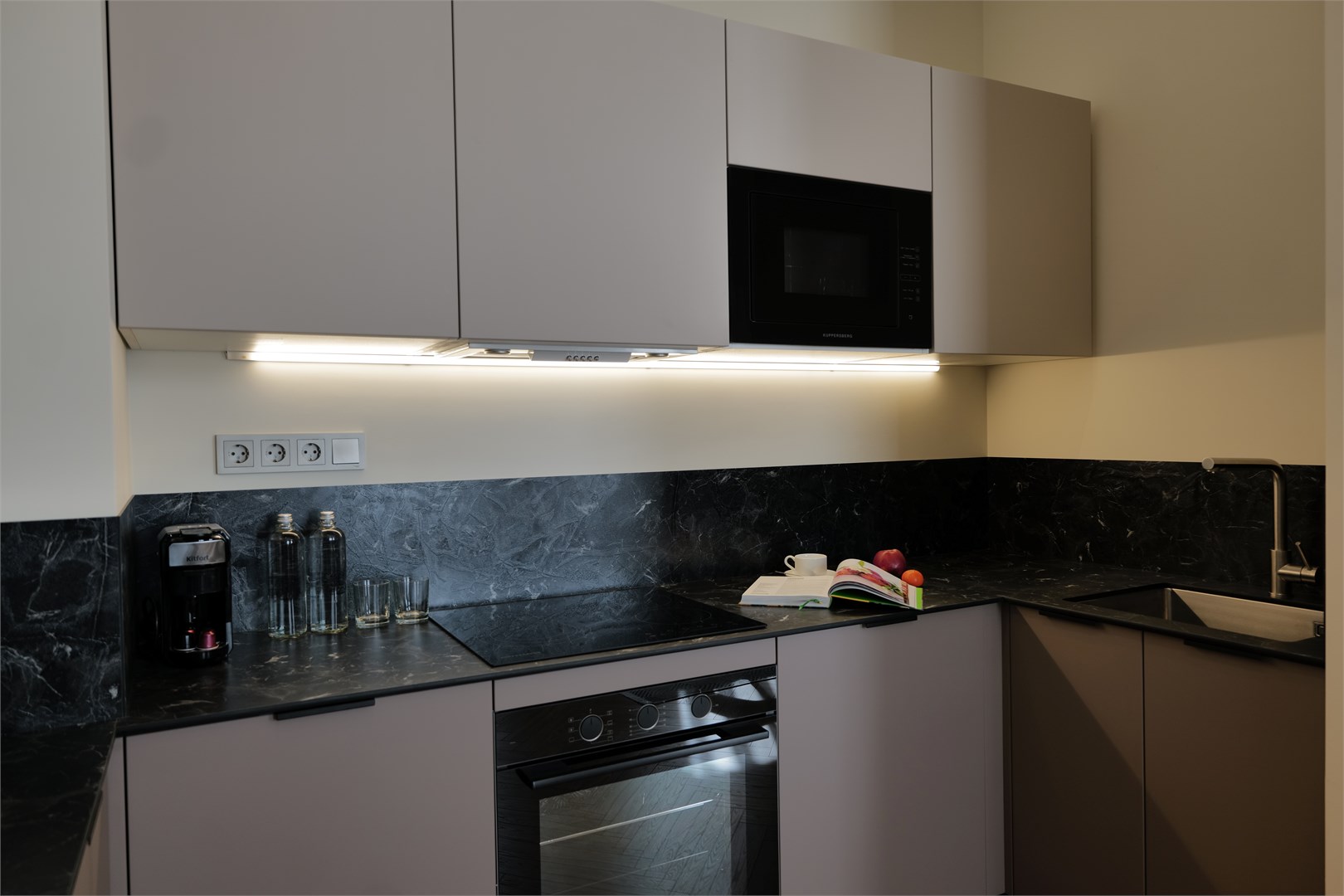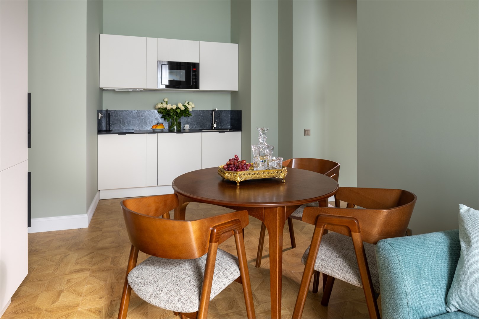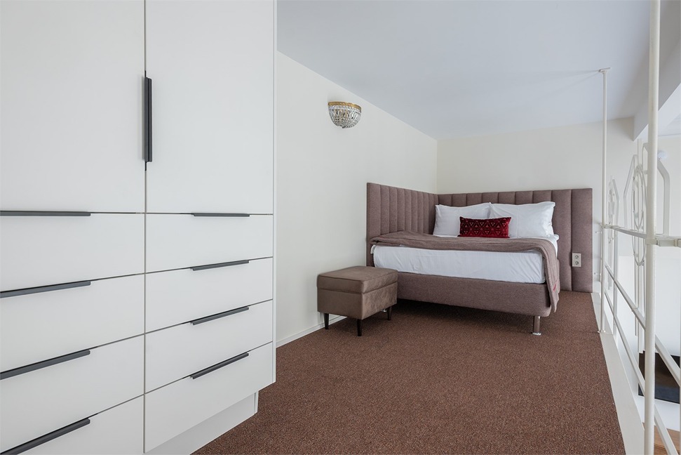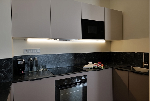 В номере: вешалка, диван раскладной, зеркало, кресло, кровать двуспальная, кухонная мебель, прикроватные тумбочки, стол, стол обеденный, стулья, шкаф, кондиционер, кофемашина, микроволновая печь, набор посуды, плита электрическая, посудомоечная машина, сейф, стиральная машина, телевизор, телефон, холодильник, чайная станция