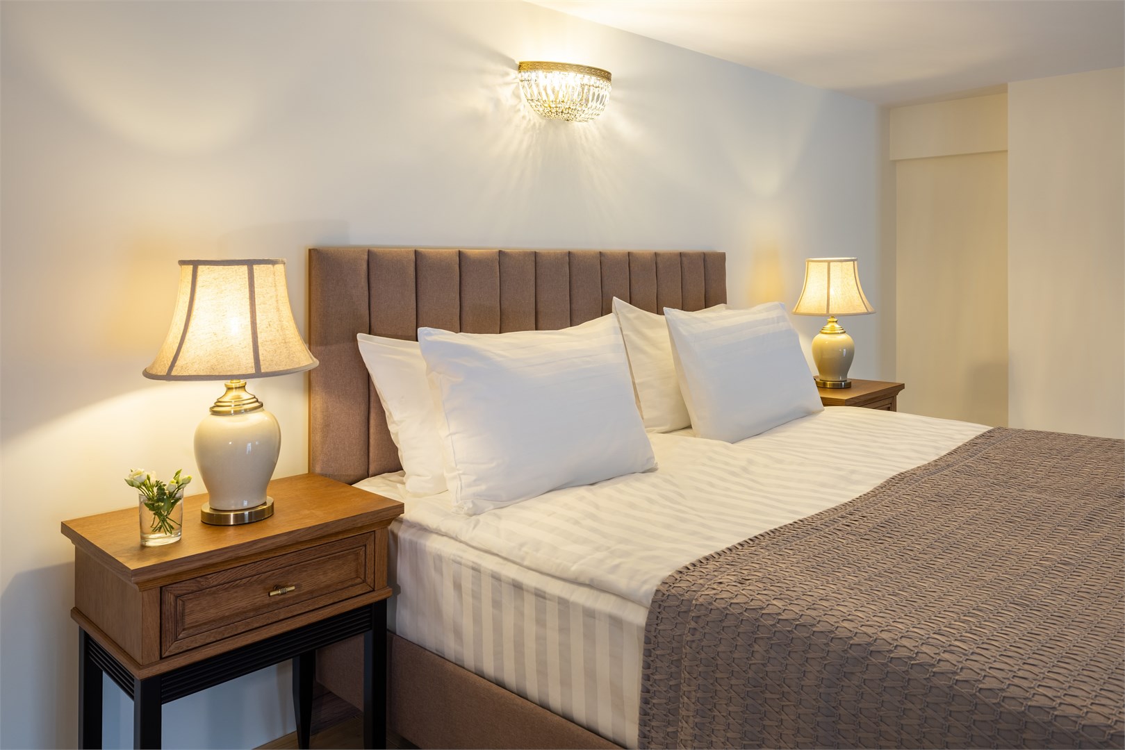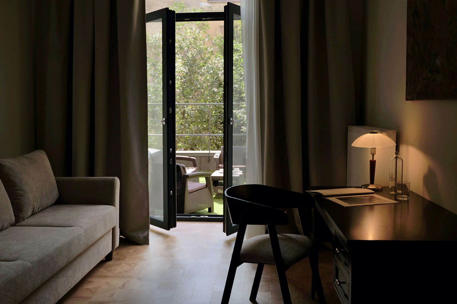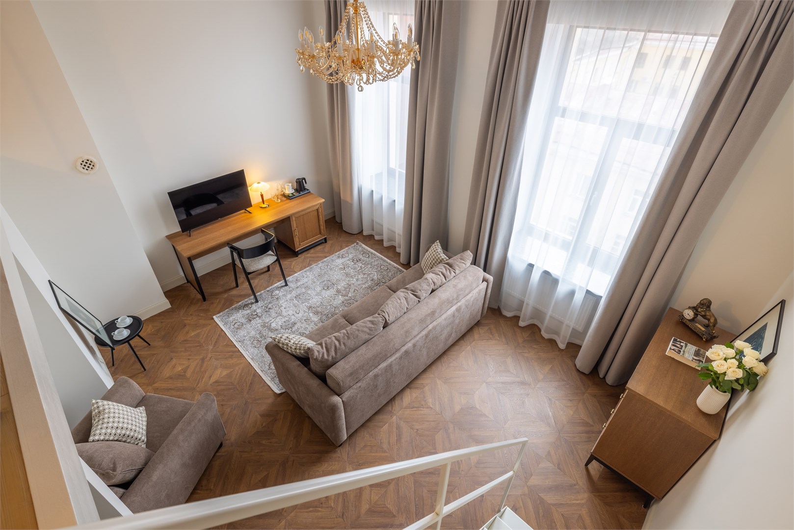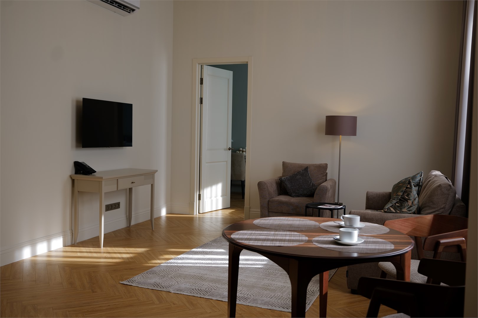 В номере: вешалка, диван, зеркало, кресло, кровать двуспальная, прикроватные тумбочки, стол, стул, шкаф, кондиционер, кофемашина, мини-холодильник, сейф, телевизор, телефон, чайная станция