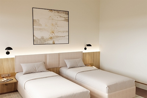 В номере: вешалка, зеркало, кровати односпальные /одна двуспальная кровать, прикроватные тумбочки, стол, стул, шкаф, кондиционер, мини-холодильник, сейф, телевизор, телефон, утюг, чайная станция, чайный набор посуды