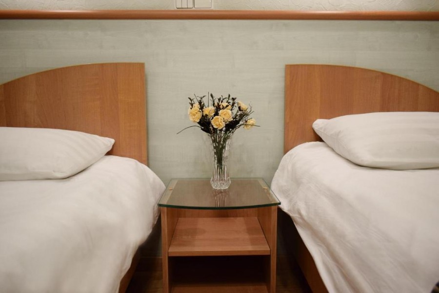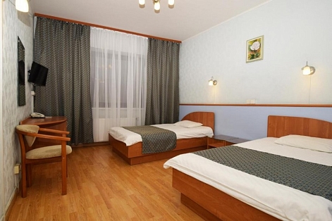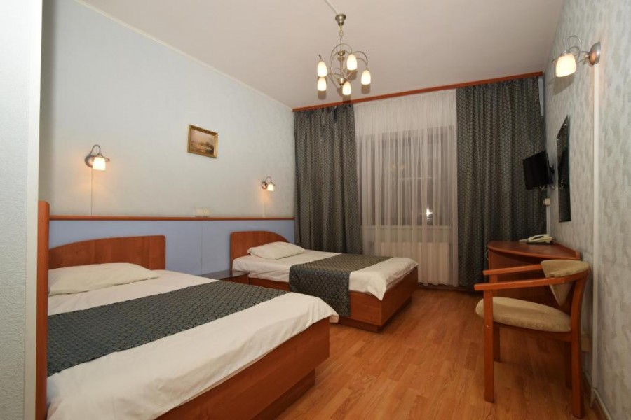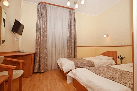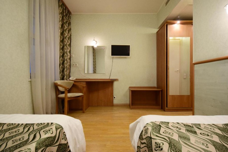 В номере: вешалка, зеркало, кровати односпальные, прикроватные тумбочки, стол, стул, тумба багажная, шкаф, мини-холодильник, телевизор ЖК, телефон