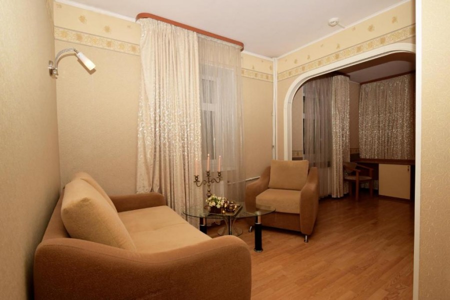 В номере: вешалка, диван раскладной, зеркало, кресло, кровать двуспальная, прикроватные тумбочки, стол, столик журнальный, стул, тумба багажная, шкаф, мини-холодильник, телевизор ЖК, телефон