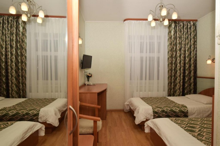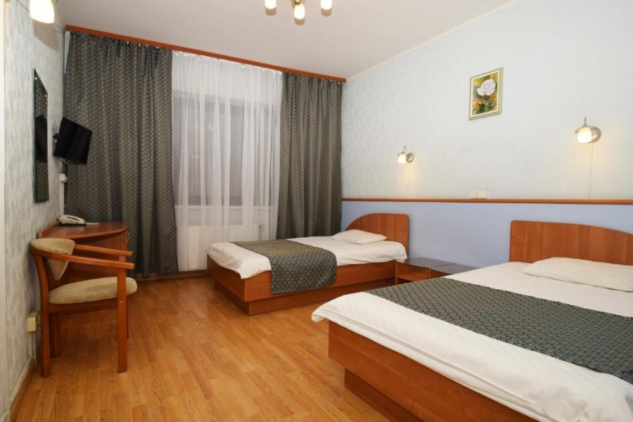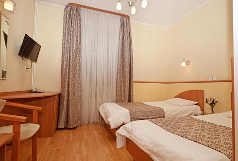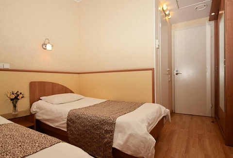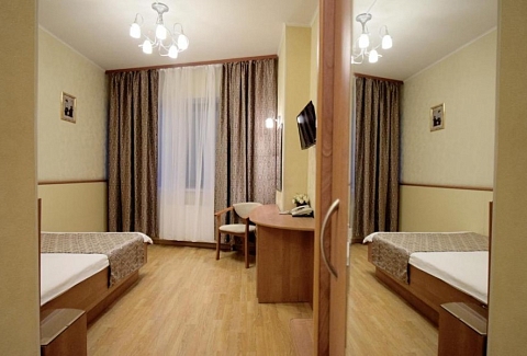 В номере: вешалка, зеркало, кровати односпальные, прикроватные тумбочки, стол, стул, тумба багажная, шкаф, мини-холодильник, телевизор ЖК, телефон