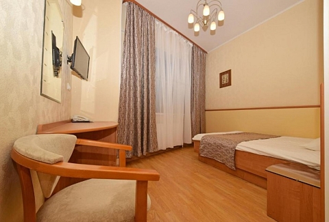 В номере: вешалка, зеркало, кровать односпальная, прикроватная тумбочка, стол, стул, тумба багажная, шкаф, мини-холодильник, телевизор ЖК, телефон