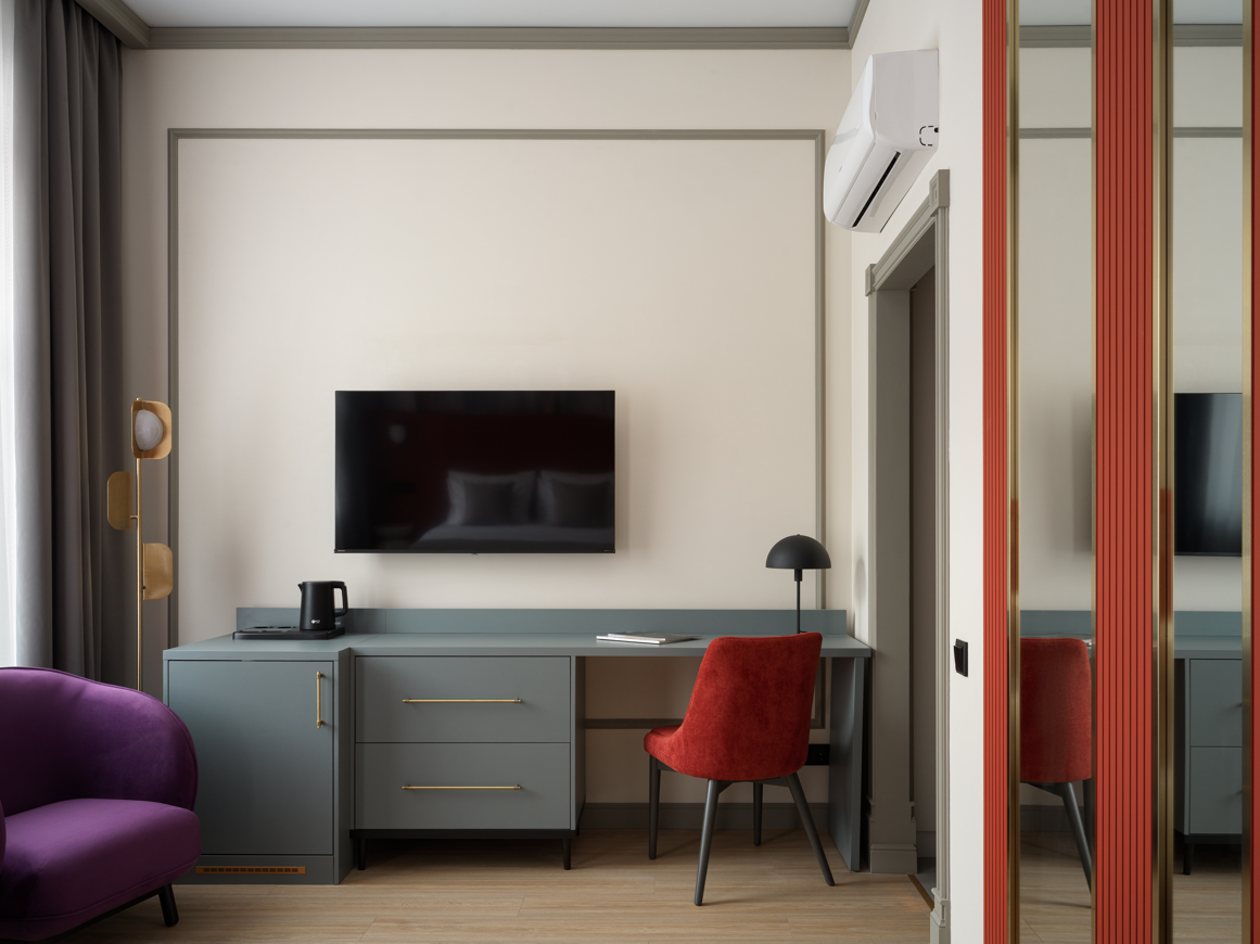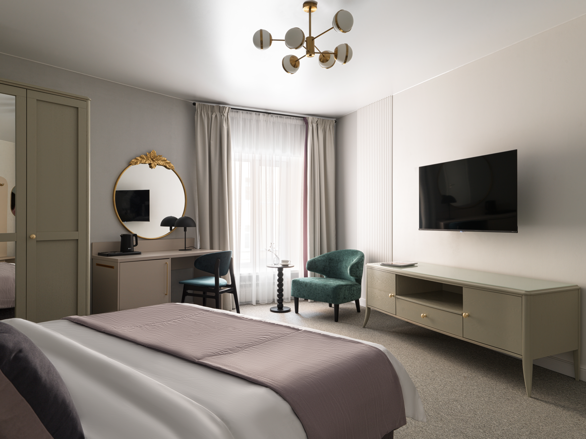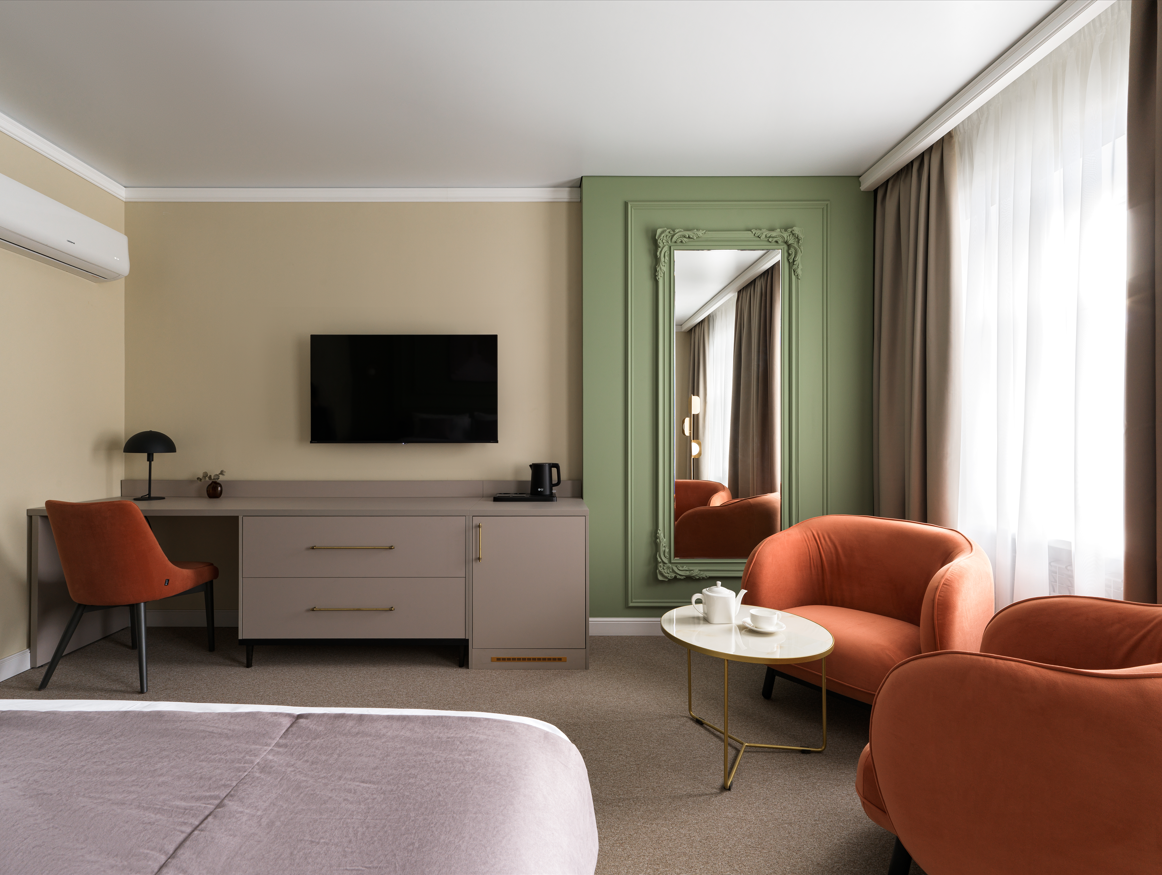 В номере: вешалка, диван раскладной, зеркало, кровати односпальные /одна двуспальная кровать, набор мягкой мебели, прикроватные тумбочки, столик туалетный, тумба багажная, шкаф, кондиционер, мини-холодильник, сейф, телевизор, телефон, чайная станция, чайный набор посуды, электрочайник