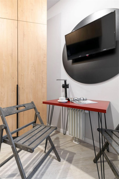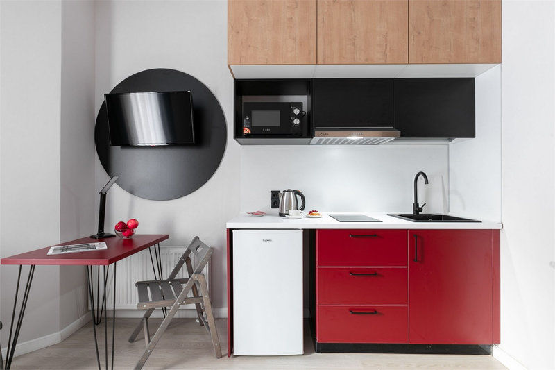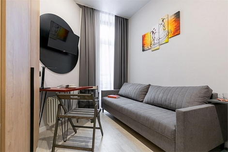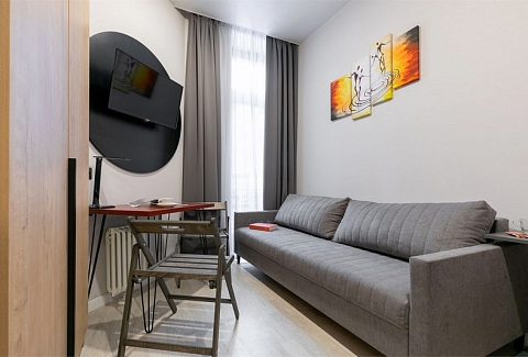 В номере: вешалка, диван раскладной, зеркало, стол, стул, шкаф, микроволновая печь, мини-холодильник, набор посуды, плита, телевизор, чайник