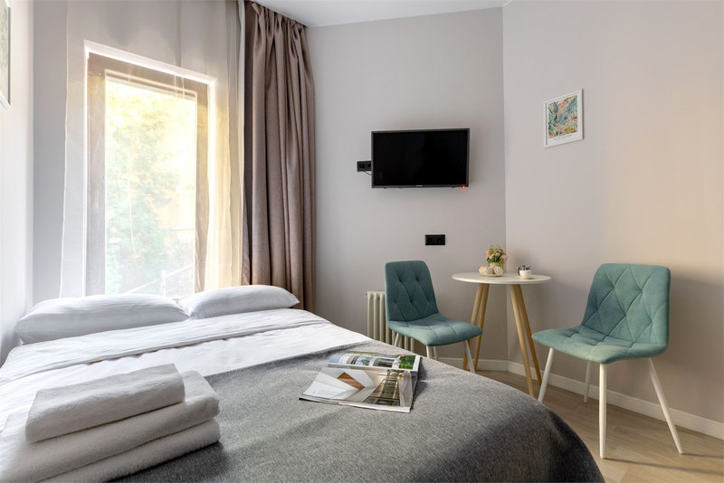 В номере: вешалка, диван раскладной, зеркало, кровать двуспальная, стол, стул, микроволновая печь, мини-холодильник, набор посуды, плита, телевизор, чайник