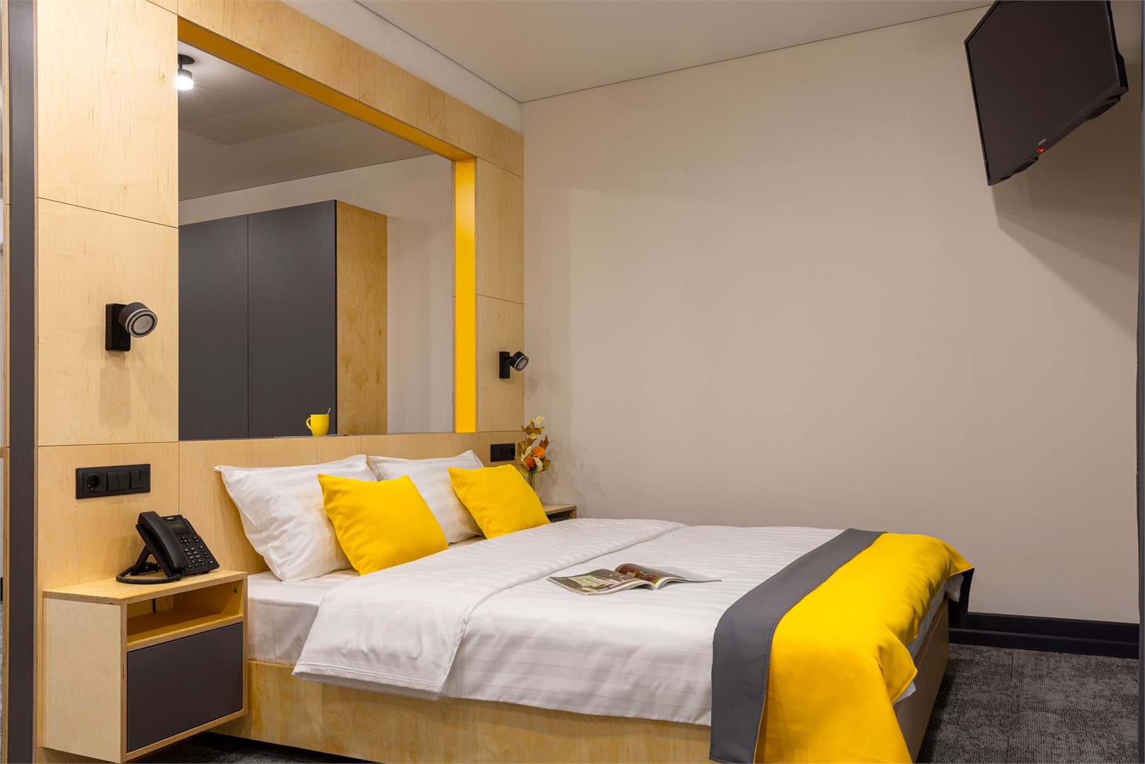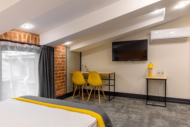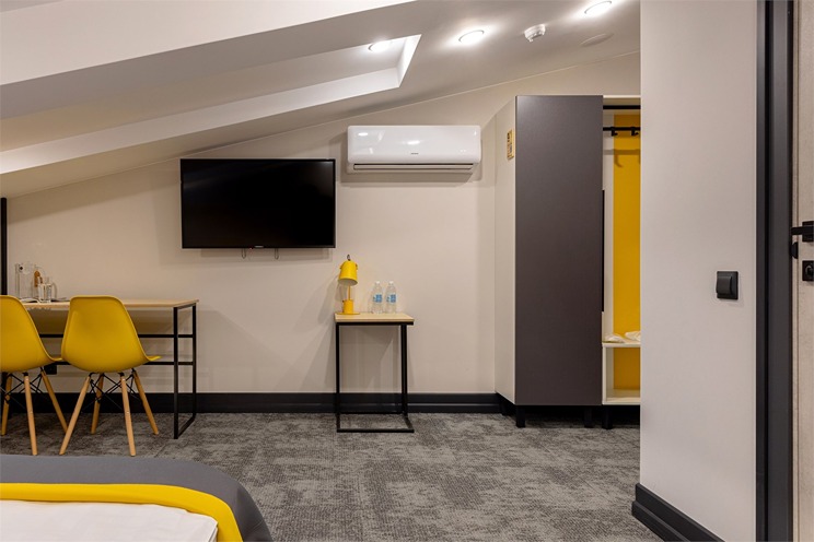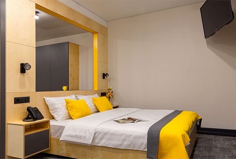 В номере: вешалка, зеркало, кресло-кровать, кровать двуспальная, стол, стулья, шкаф, кондиционер, микроволновая печь, мини-холодильник, набор посуды, плита индукционная, сейф, телевизор, телефон, электрочайник