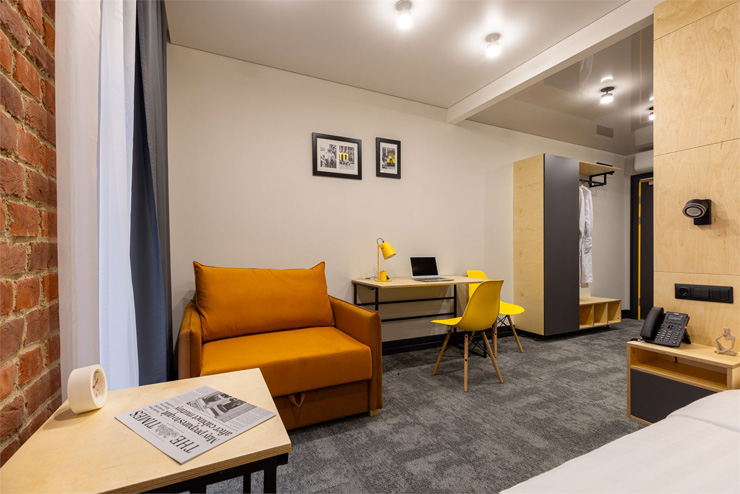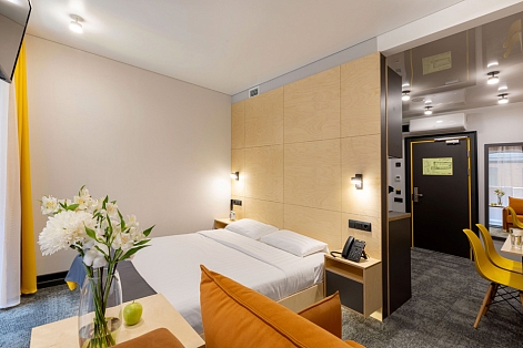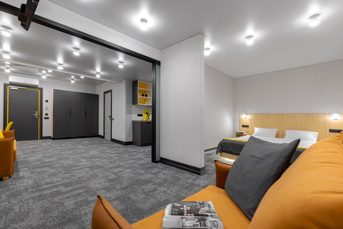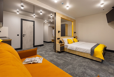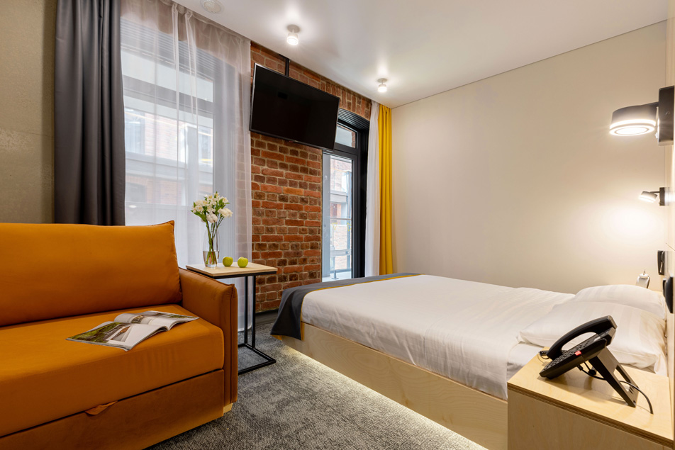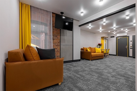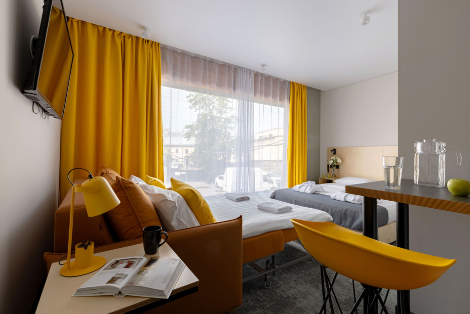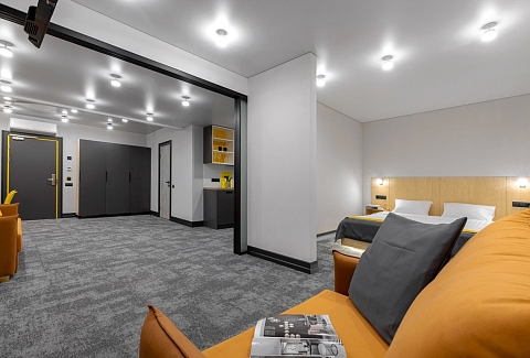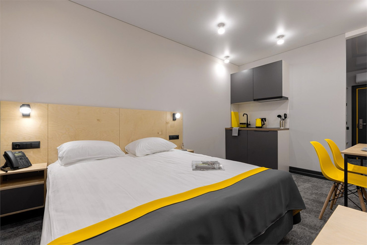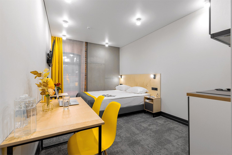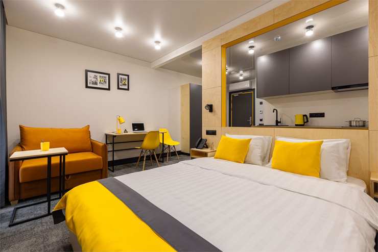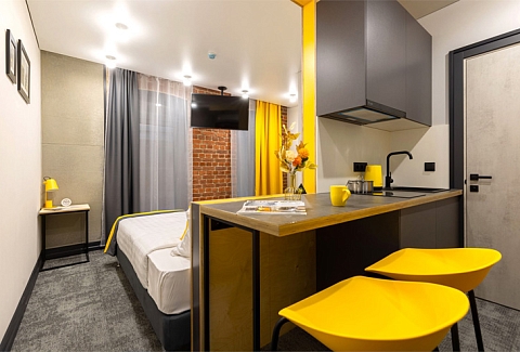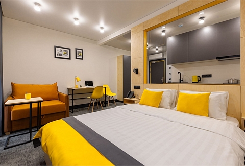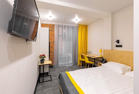 Все категории полностью подготовлены к заселению постояльцев: располагают удобными спальными местами, функциональной мини-кухней, индивидуальной ванной комнатой. Доступно подключение к Wi-Fi. Возможно проживание с питомцем мелкой породы.На территории организованы лаундж- и арт-зоны, библиотека. Во внутреннем дворе у здания обустроена вместительная автостоянка.