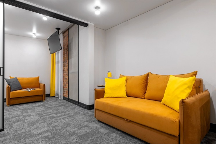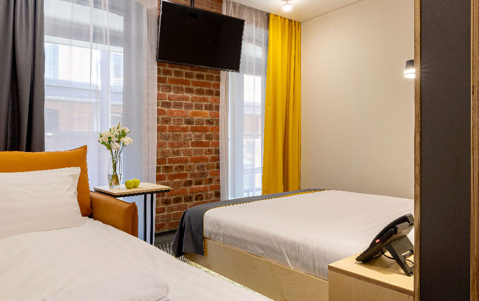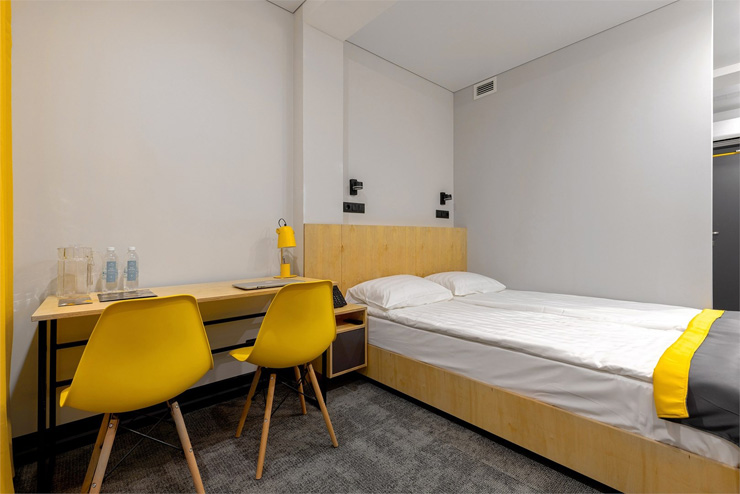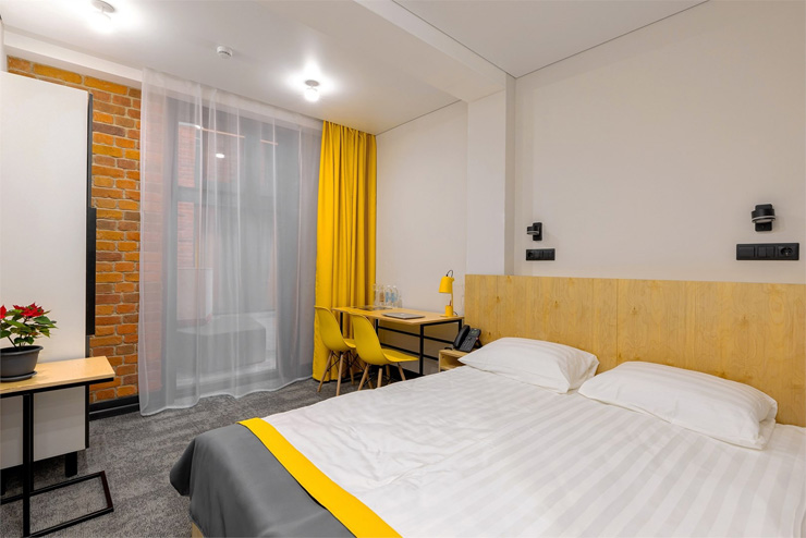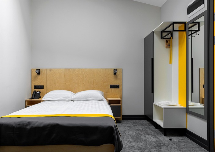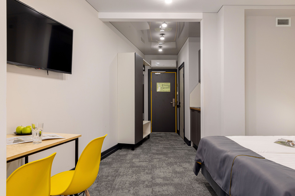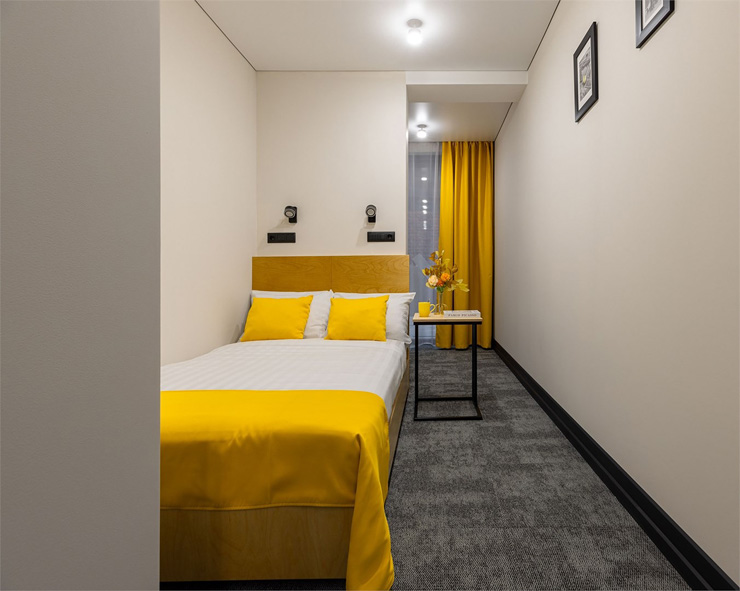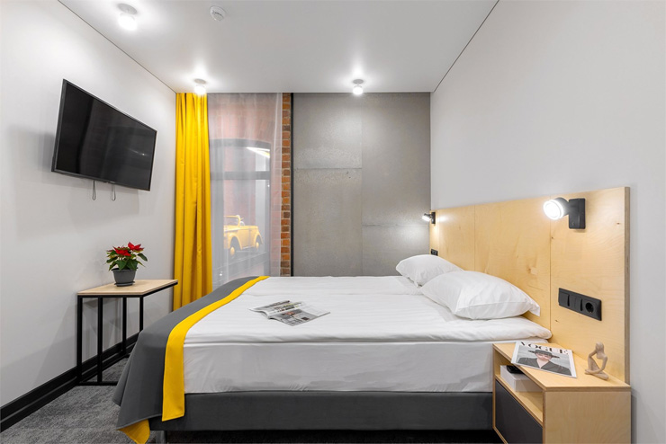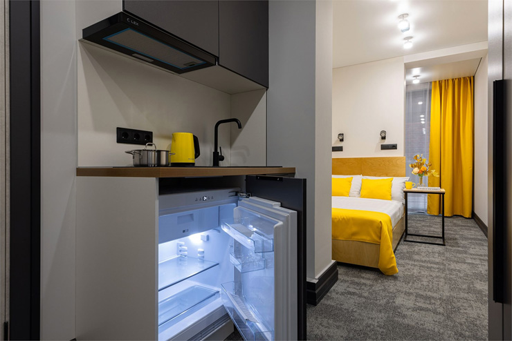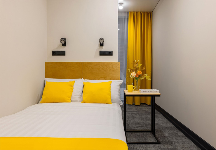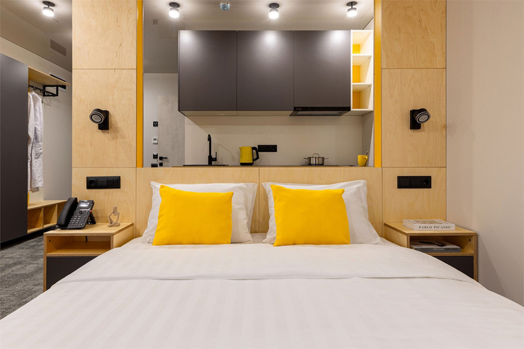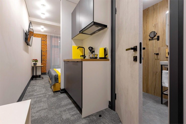 Все категории полностью подготовлены к заселению постояльцев: располагают удобными спальными местами, функциональной мини-кухней, индивидуальной ванной комнатой. Доступно подключение к Wi-Fi. Возможно проживание с питомцем мелкой породы.На территории организованы лаундж- и арт-зоны, библиотека. Во внутреннем дворе у здания обустроена вместительная автостоянка.
