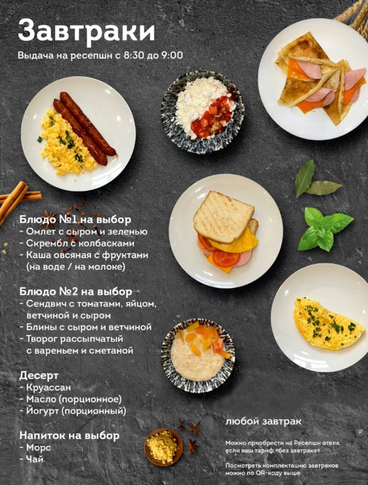 - завтрак континентальный (при выборе пакета с питанием)