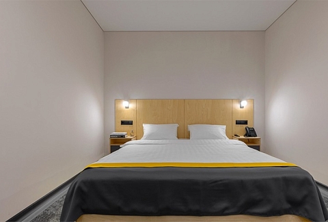 В номере: вешалка, зеркало, кровать двуспальная, прикроватный столик, стол, стулья, шкаф, кондиционер, микроволновая печь, мини-холодильник, набор посуды, плита индукционная, сейф, телевизор, электрочайник