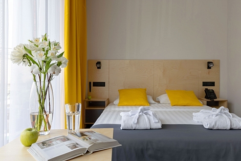 В номере: вешалка, зеркало, кровати односпальные /одна двуспальная кровать, прикроватный столик, стол, стулья, шкаф, кондиционер, микроволновая печь, мини-холодильник, набор посуды, плита индукционная, сейф, телевизор, телефон, электрочайник