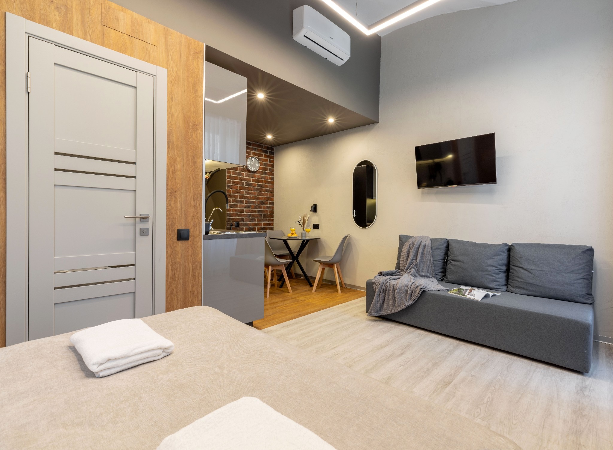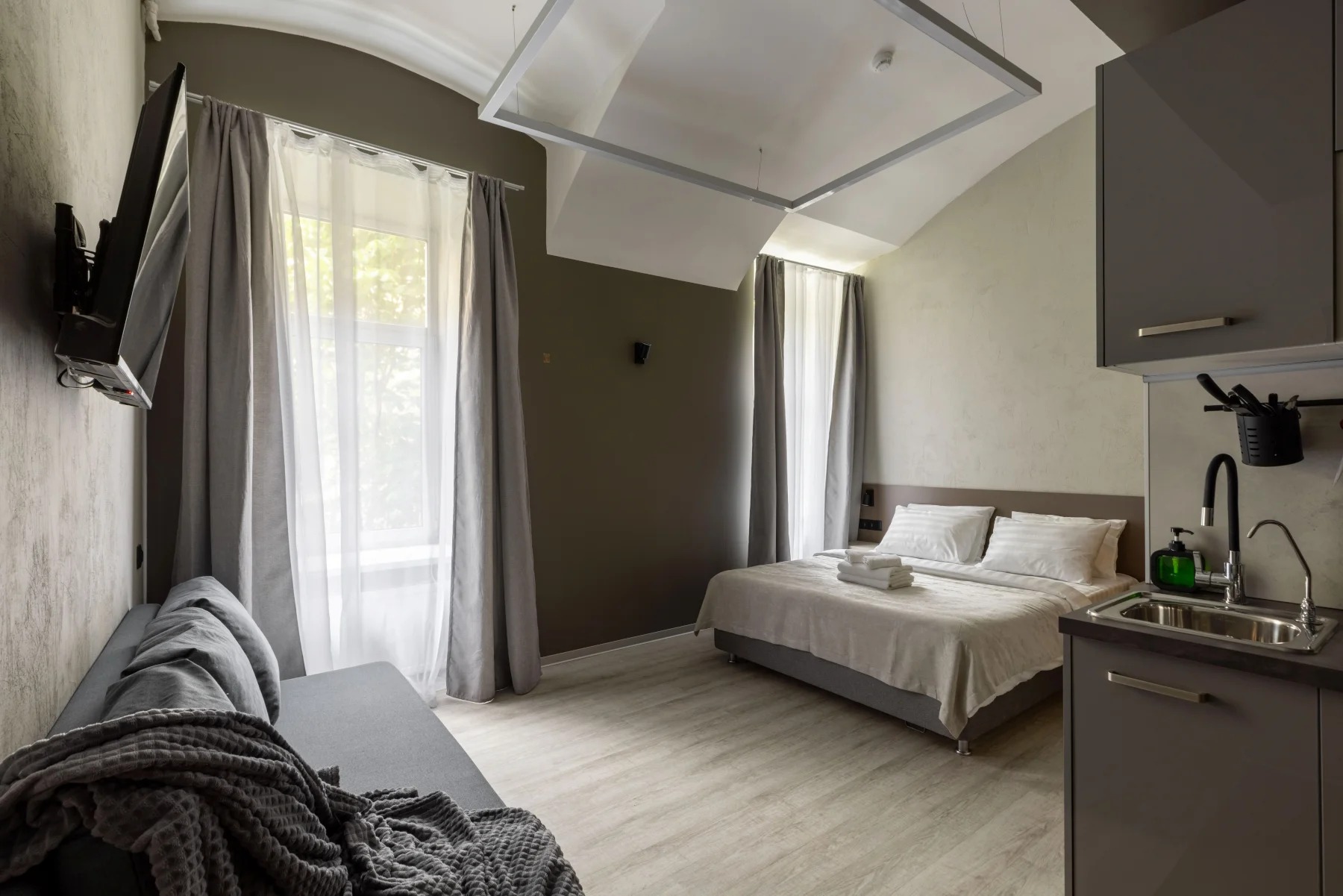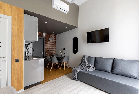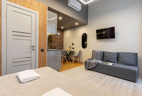 В номере: диван раскладной, зеркало, кровать двуспальная, прикроватные тумбочки, стол, стул, шкаф, кондиционер, кофемашина, микроволновая печь, набор посуды, плита электрическая, телевизор ЖК, чайный набор посуды, электрочайник