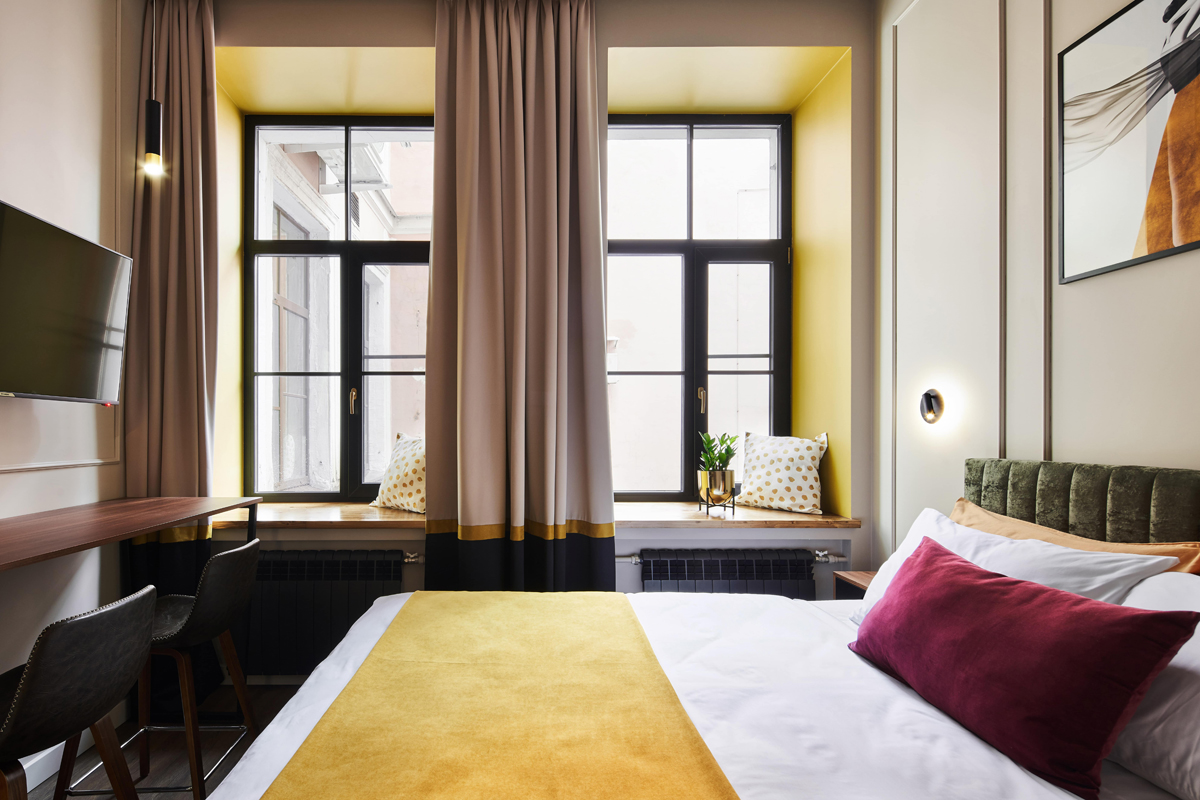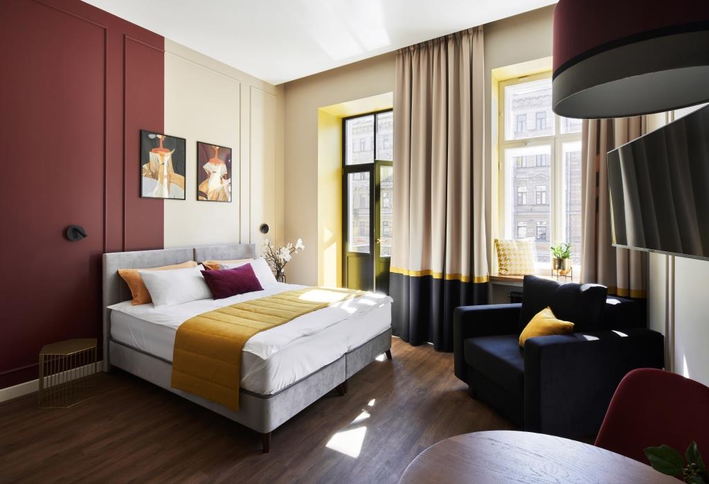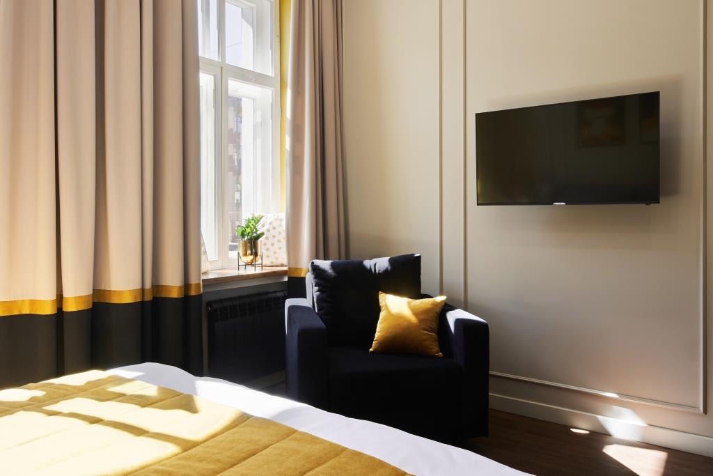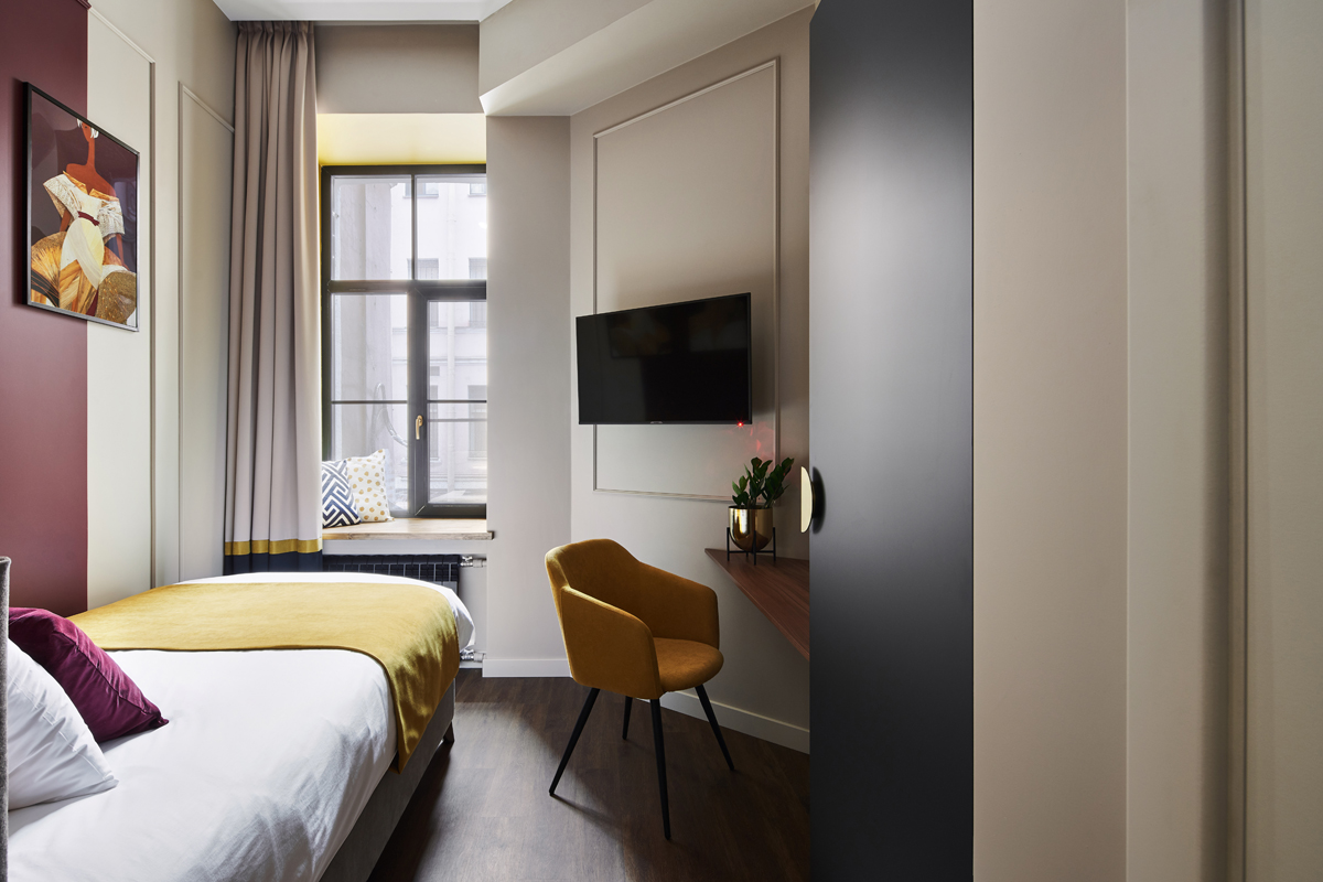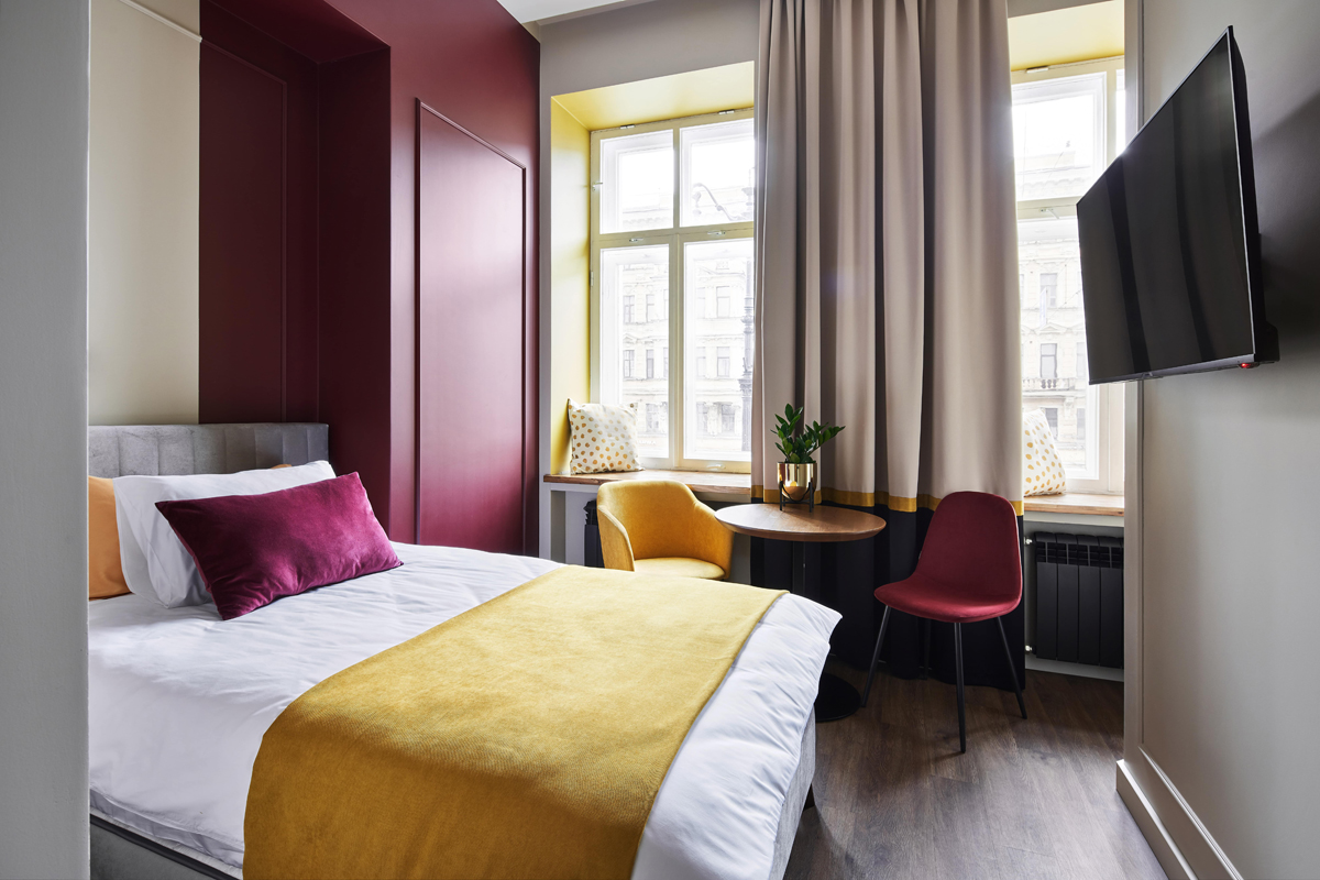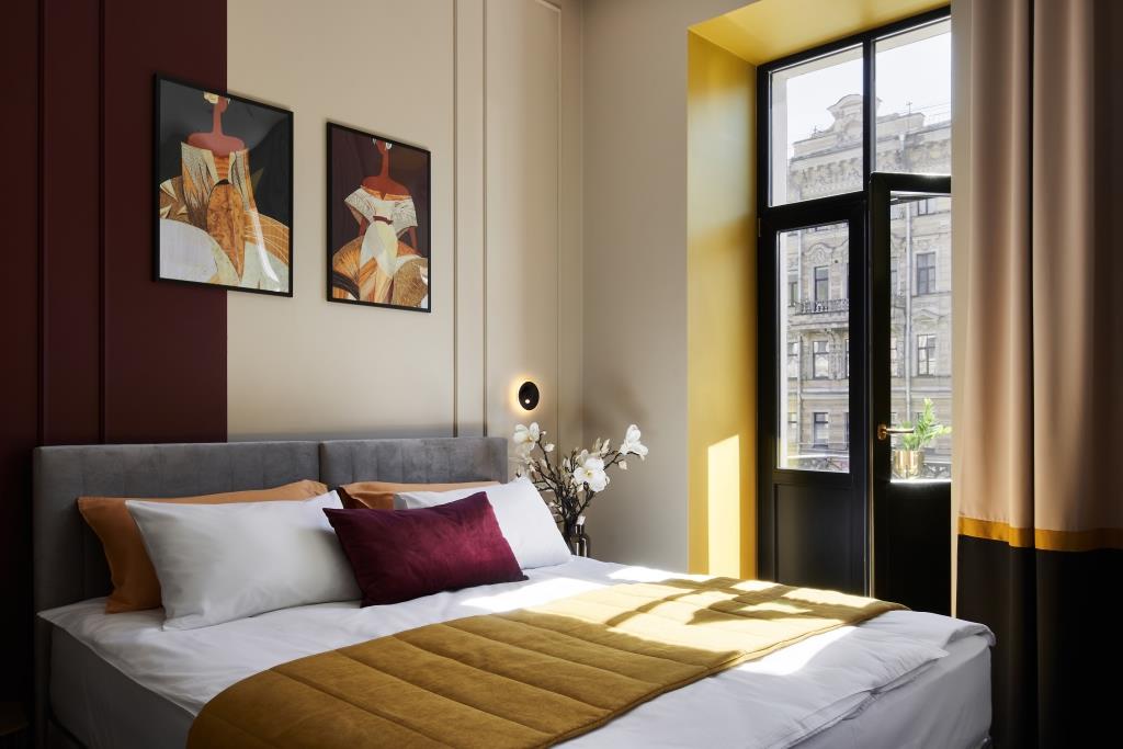 Отель занимает часть четырехэтажного исторического здания, расположенного на Невском проспекте. Жилой фонд — небольшой, гостям предлагается только 18 номеров, однако, все номера уютные со стильным современным интерьером, выдержанном в приятной цветовой гамме. В каждой комнате имеется индивидуальный санузел с душем, установлен кондиционер, есть необходимая техника — телевизор, фен, электрочайник, из некоторых номеров открывается вид на Невский проспект.В отеле работает кафе, где по утрам для гостей накрываются завтраки. Также среди услуг — беспроводной интернет.