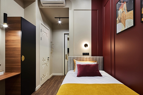 В номере: вешалка, зеркало, кровать односпальная, прикроватные тумбочки, стол, стул, гладильная доска, кондиционер, телевизор ЖК, утюг, чайная станция, электрочайник