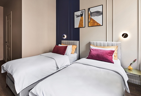 В номере: вешалка, диван, зеркало, кровати односпальные /одна двуспальная кровать, прикроватные тумбочки, стол, стулья, гладильная доска, кондиционер, телевизор ЖК, утюг, чайная станция, электрочайник