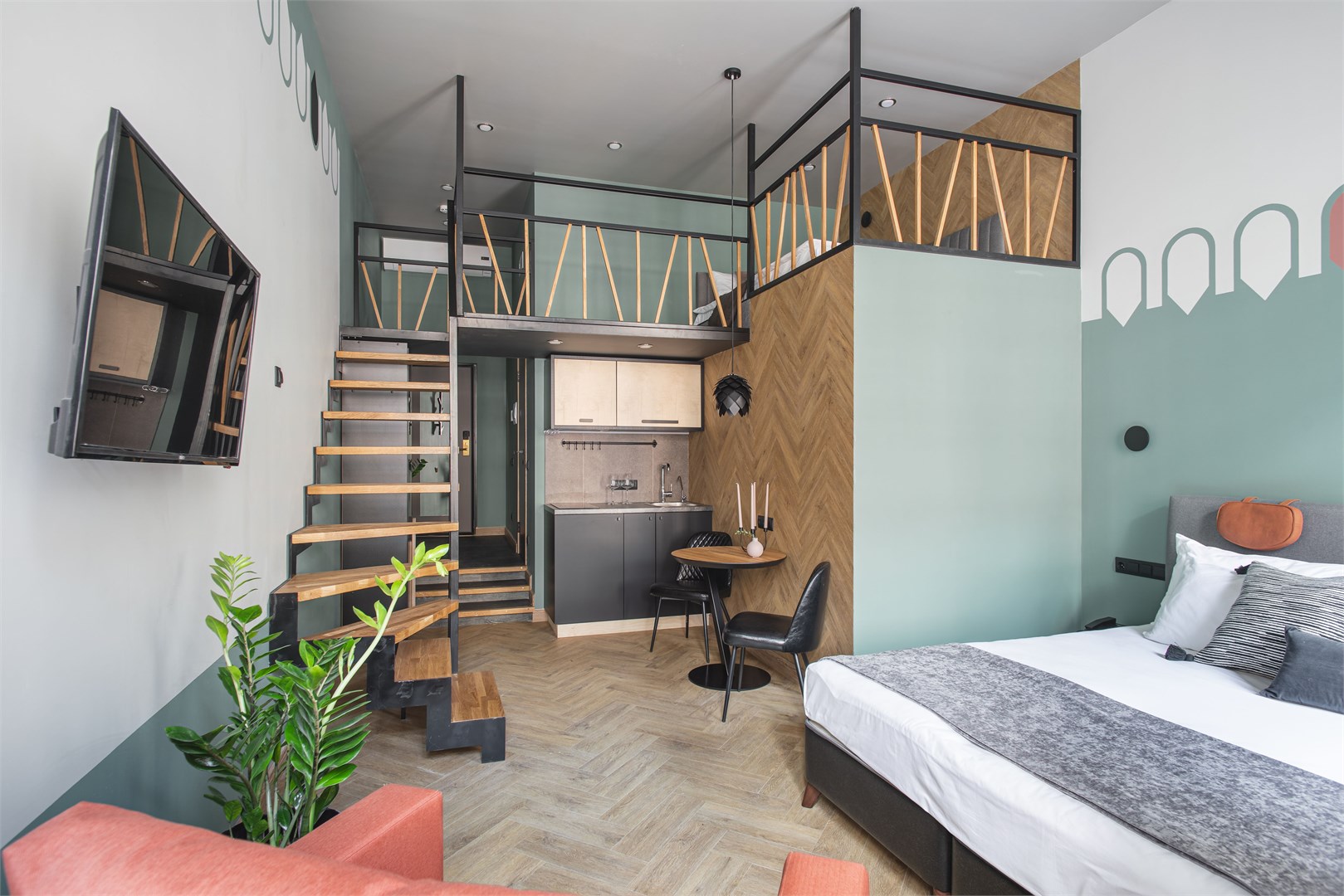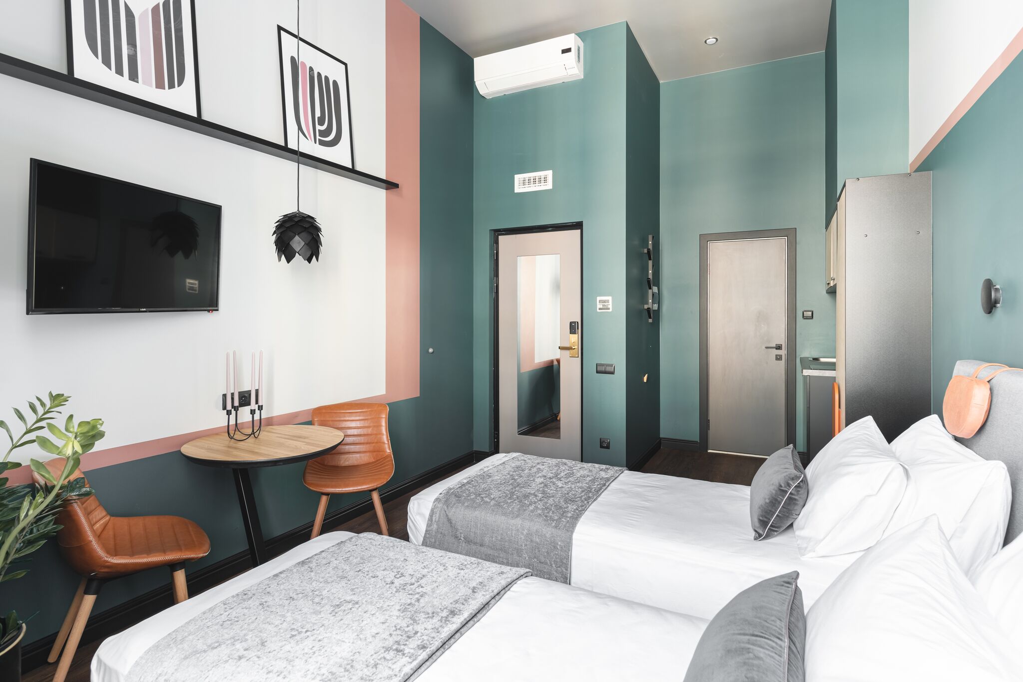 В номере: вешалка, зеркало, кресло-кровать, кровать двуспальная, кровать односпальная, прикроватные тумбочки, стол, стул, шкаф, кондиционер, сейф, телевизор ЖК, чайная станция